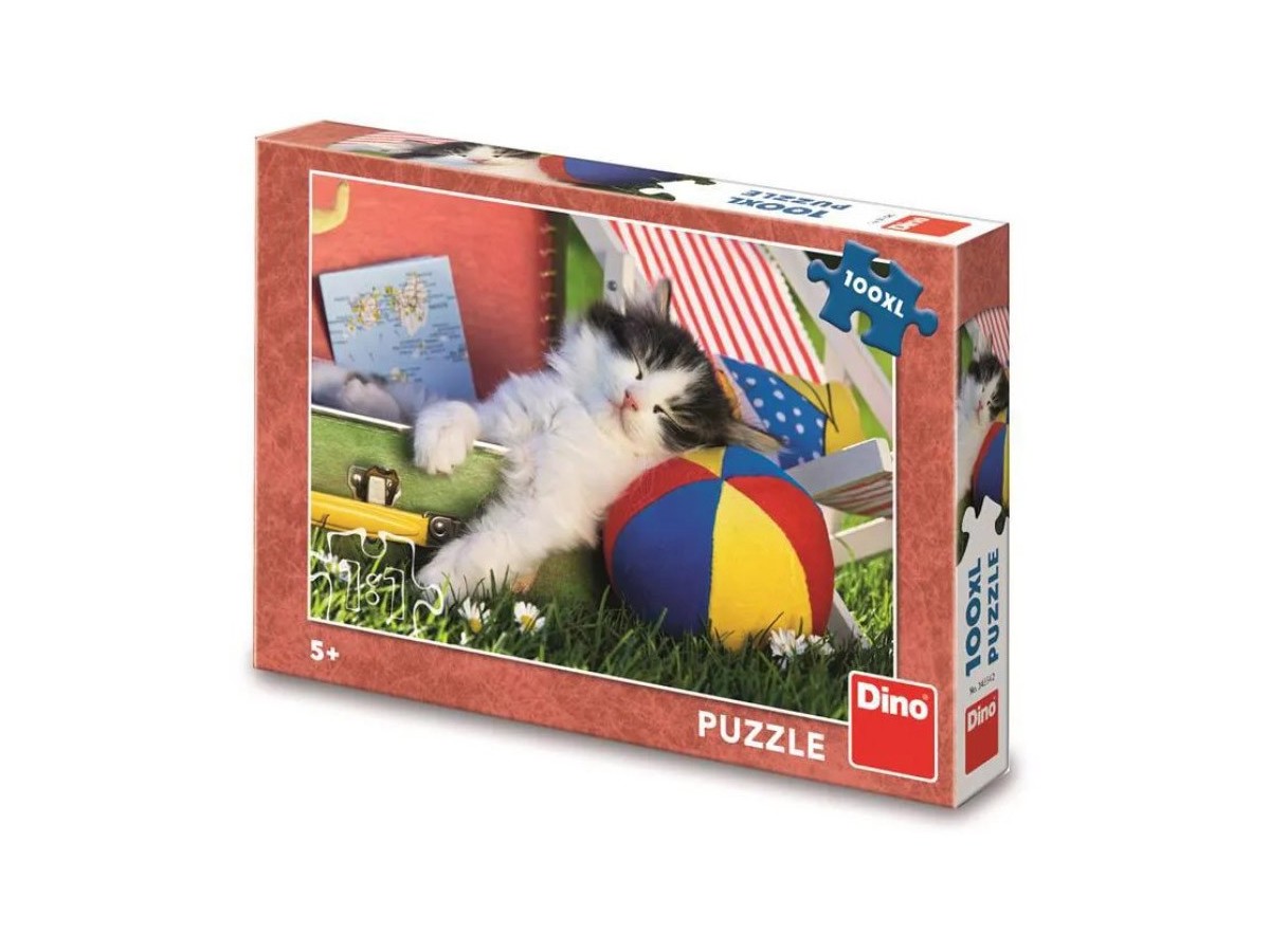 Imaginea acestui puzzle cu 100 piese Dino - Kitten nap (Dino-34354) surprinde un pui de pisică într-o scenă colorată și veselă. Pisica cu blana albă și pete negre și maronii se odihnește pe o pajiște verde, înconjurată de elemente de joc precum o minge colorată și o cutie cu jucării și cărți. Totul emana o atmosferă relaxantă și jucăușă.