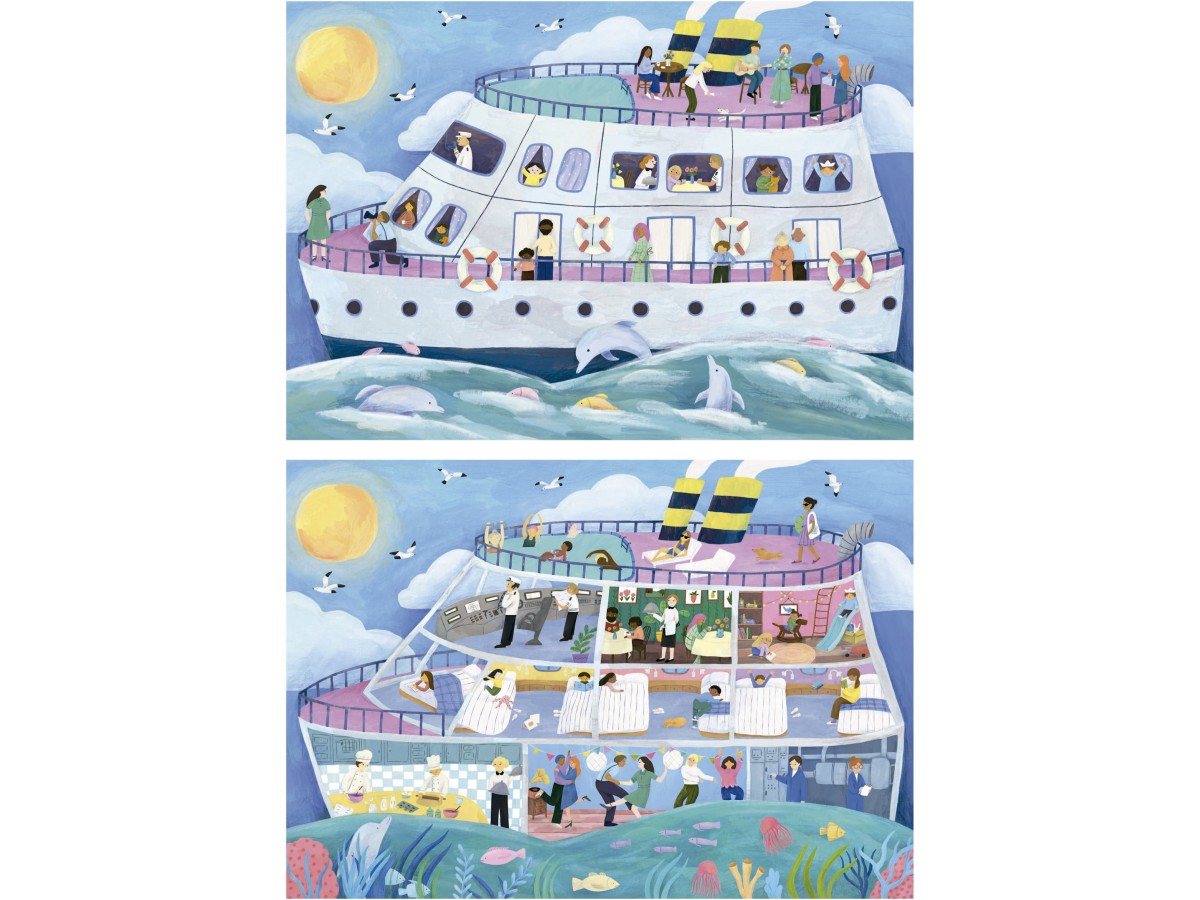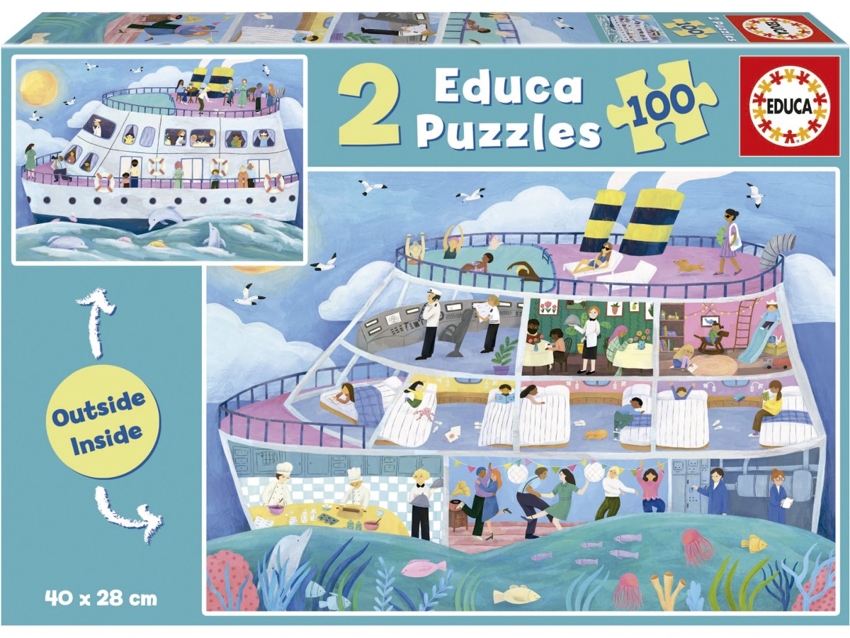 Imaginea puzzle-ului cu 100 de piese Educa - Inside/Outside - Vessel (Educa-19958) prezintă un vas în format ilustrație, din două perspective diferite: partea de sus a vasului și o vedere subacvatică. Vasul este plin de activitate, cu oameni care se bucură de timpul lor pe punte, unii stau de vorbă, alții se relaxează sub umbrele. În secțiunea inferioară a ilustrației, interiorul vasului este revelat, prezentând o bucătărie, o sală de mese și câteva cabine. De asemenea, sub apă pot fi văzute diferite forme de viață marină, cum ar fi pești și corali, culorile fiind viu colorate pentru a ilustra varietatea vieții marine.