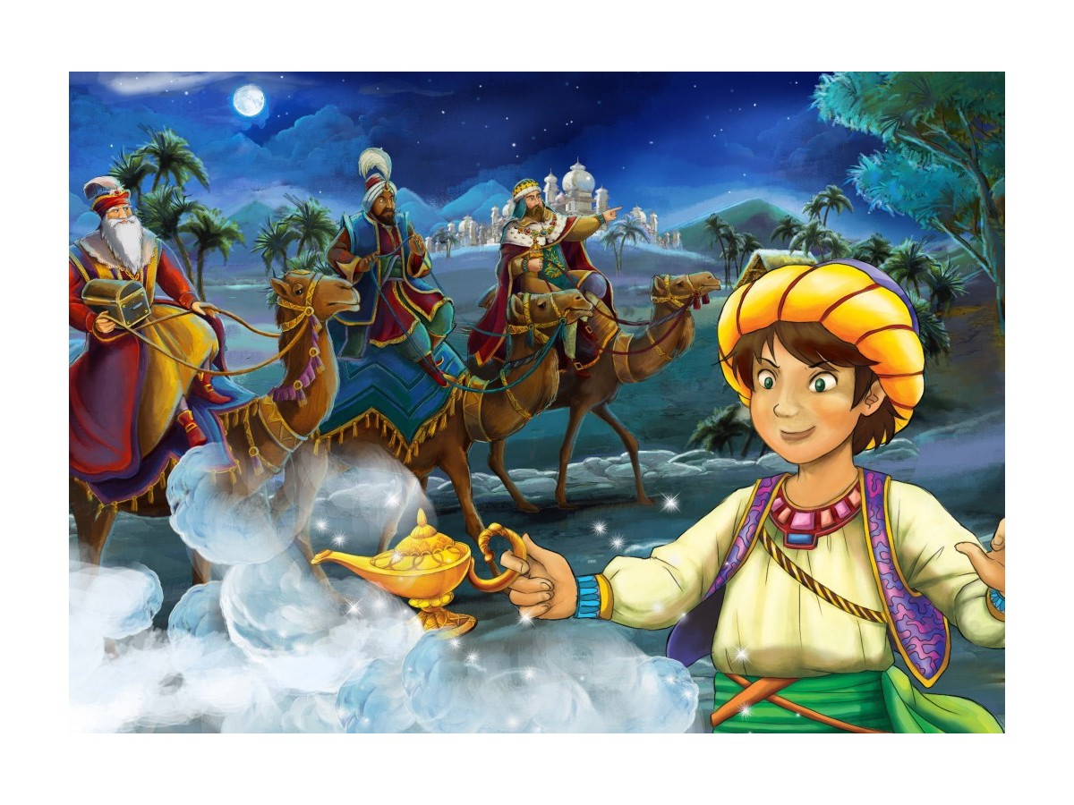 Această ilustrație vibrantă redă o scenă inspirată din povestea clasică Aladdin, cunoscută în special prin adaptările Disney. În prim-plan, observăm un tânăr îmbrăcat în haine tradiționale orientale, ținând o lampă magică din care se ivesc aburi sau fumuri, sugestia unui spirit magic. În fundal, trei personaje călăresc pe cămile, purtând veșminte regale și turbane, sugerând o coloană de trei magi sau comercianți bogați din basmele orientale. Scena este plasată noaptea, cu un cer înstelat și o lună plină, fundalul evocă misterele nopților în deșert.