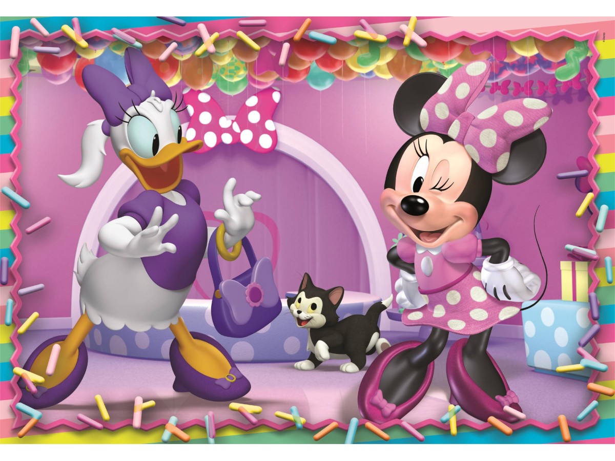 Ilustrația puzzle-ului cu 104 piese XXL Clementoni - Minnie (Clementoni-25055) prezintă o scenă animată cu Minnie Mouse și Daisy Duck din universul Disney, într-un decor festiv și colorat. Minnie, recunoscută pentru rochia și funda roz cu buline albe, dansează veselă, ținând o umbrelă, alături de Daisy, surprinsă într-o expresie de surpriză și bucurie. În fundal, se poate observa un decor de scenă cu baloane și confetti, creând o atmosferă de sărbătoare.