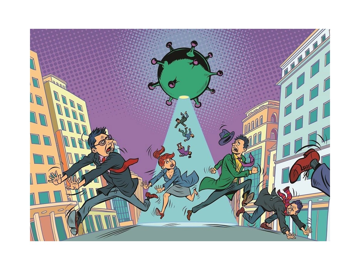 Ilustrația digitală prezintă o scenă urbană vibrant colorată, în care un grup de patru persoane pare să fugă speriate de o uriașă reprezentare stilizată a unui virus. Virusul, amplasat central, domină compoziția și este desenat în nuanțe de verde cu detalii roșii, evocând imagini tipice ale virusurilor văzute în microscoape, dar cu o interpretare artistică exagerată și animată. În jurul virusului, clădiri înalte în stil art deco contribuie la atmosfera de metropolă agitată, iar cerul este ilustrat cu o paletă de mov și roz, adăugând un contrast vibrant în compoziție.