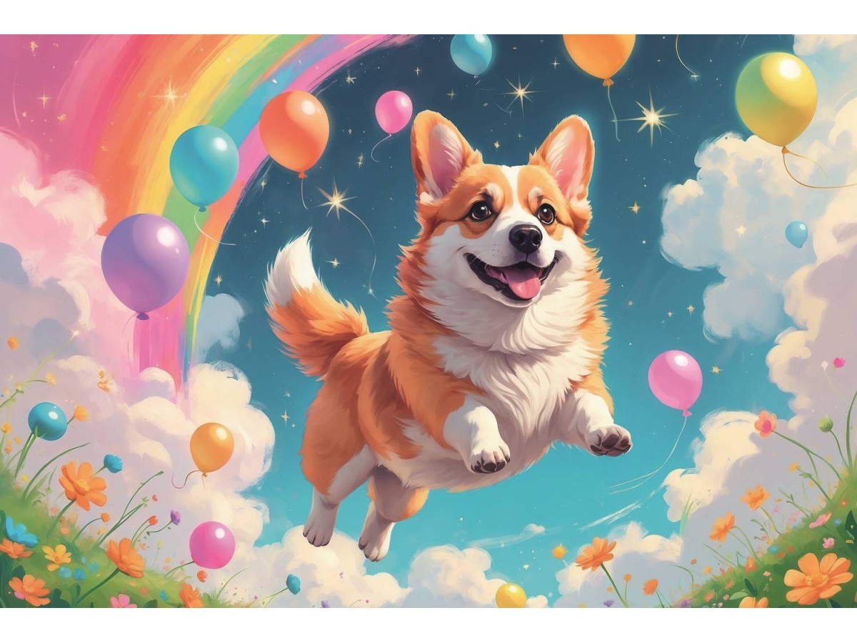 Imaginea captează o scenă veselă și colorată în care un cățel de rasă Corgi zboară prin aer, înconjurat de baloane colorate și flori sălbatice. În fundal, cerul este senin și presărat cu câteva nori pufoși, evocând o zi perfectă de primăvară. Scene ca aceasta, pline de culoare și bucurie, adesea inspiră un sentiment de libertate și veselie. Ilustrația este executată în stil digital, cu linii curate și culori vibrante, ce oferă o imagine detaliată și atrăgătoare, perfectă pentru a evoca o stare de fericire și înviorare.