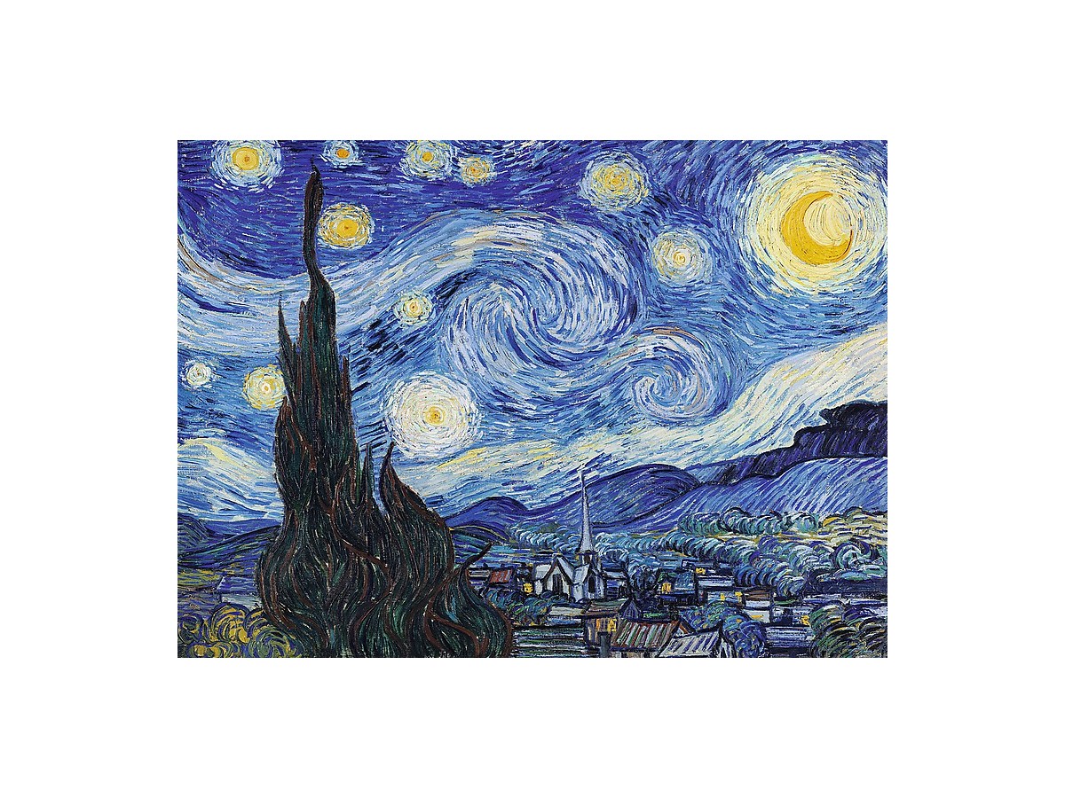 Această pictură, intitulată Noaptea înstelată, este una dintre cele mai recunoscute lucrări ale lui Vincent van Gogh. Imaginea prezintă un peisaj nocturn vibrant, dominat de un cer tumultuos în care vârtejurile de stele galbene strălucesc intens pe un fundal de albastru închis. Sub acest cer dinamic, peisajul terestru pare învăluit într-o aură misterioasă, cu o configurație de case și structuri simple, accentuate de lumina palidă a stelelor. În partea stângă, un chiparos înalt, de un verde închis, străbate vertical compoziția, adăugând un contrast puternic față de formele organice ale cerului și liniile mai rigide ale clădirilor.
