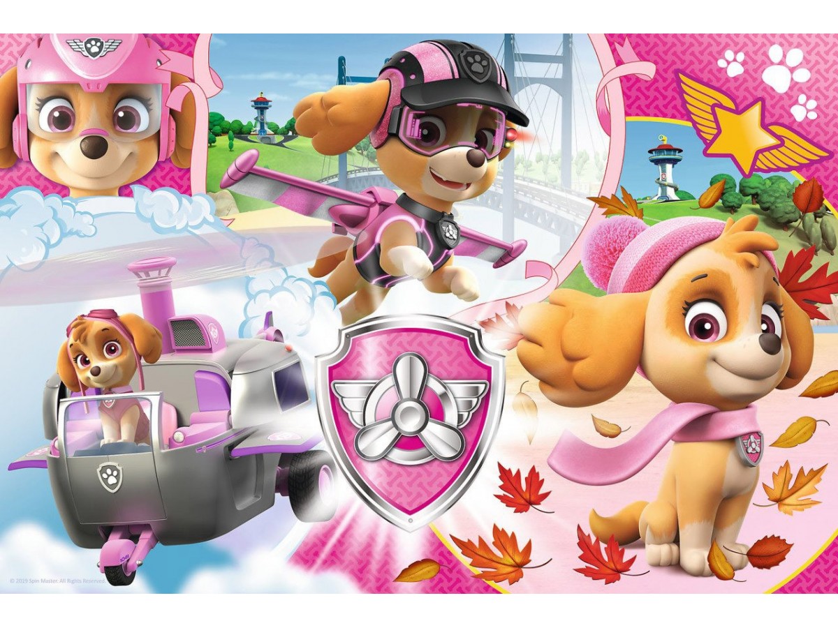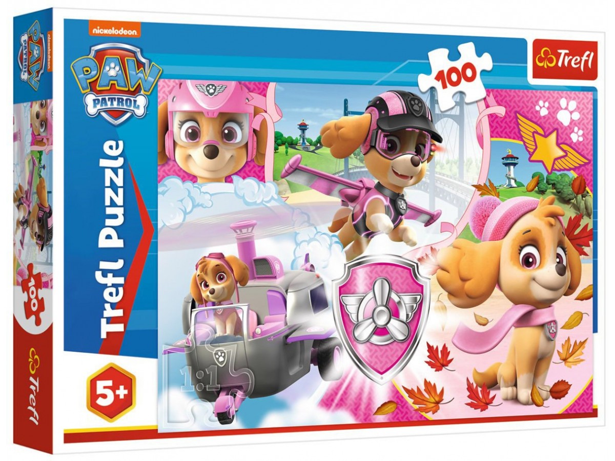 Ilustrația puzzle-ului Trefl - Paw Patrol, cu 100 de piese (16368), prezintă trei personaje canine din seria animată plasate într-un decor vibrant și colorat. Un câine purtător de ochelari de aviator și vestă maro se află într-un vehicul ce pare a fi un hibrid între motociclet și avion. Al doilea personaj, un câine roz îmbrăcat într-o ținută de pilot, se află în interiorul unei elice roz, sugerând zborul. Al treilea câine, galben și prietenos, stă pe o platformă ce pare a face parte din vehiculul central. Fundalul este decorat cu elemente ce evocă viteza și aventura, ca stele, nori și frunze colorate în nuanțe de roșu și portocaliu.
