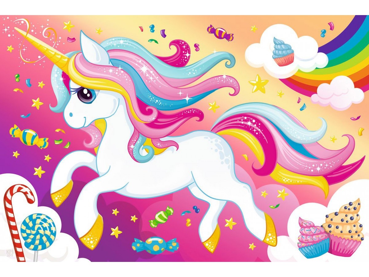 Imaginea ilustrează o scenă vibrantă și colorată, dominată de prezența unui unicorn alb cu crinul și coada în nuanțe de roz, albastru și galben. Unicornul zburdă printr-un peisaj imaginativ, populate de nori zâmbitori și dulciuri plutitoare, cum ar fi bomboane în formă de bastonașe și cupcakes în culori pastelate. Fondul este un cer în degrade de la roz la albastru, care adaugă o atmosferă de basm și visare. Astfel de imagini sunt adesea create printr-o tehnică de ilustrație digitală, care permite o abundență de detalii fine și explozie de culori.