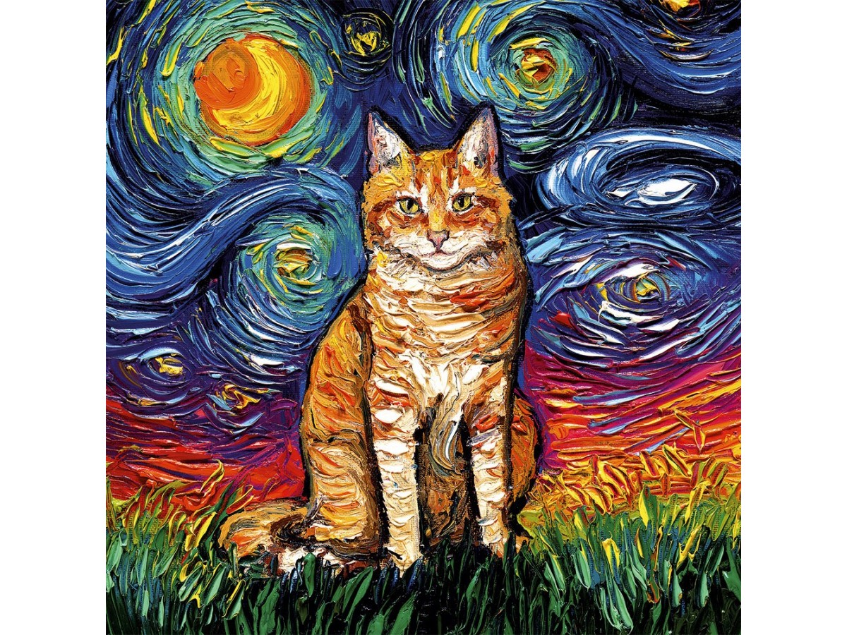 Imaginea prezentată este o interpretare artistică a renumitei opere 'Noapte Înstelată' a lui Vincent van Gogh, însă cu o modificare jucăușă și modernă: în locul cipresului obișnuit din compoziția clasică, în centru se află un pisoi portocaliu tabby. Pictura aduce în prim-planul unui peisaj nocturn vibrat și tumultuos, caracteristic pentru stilul post-impresionist al lui Van Gogh, pisoiul fiind reprezentat cu trăsături expresive și detaliat finisate. Background-ul este dominat de cercuri ondulate și linii fluide, specific stilului artistului, evidențiind contrastul între cerul nocturn agitat și culorile calde ale blănii pisicii. Culorile dominante sunt tonuri intense de albastru și galben, care oferă un contrast puternic și atrăgător vizual.