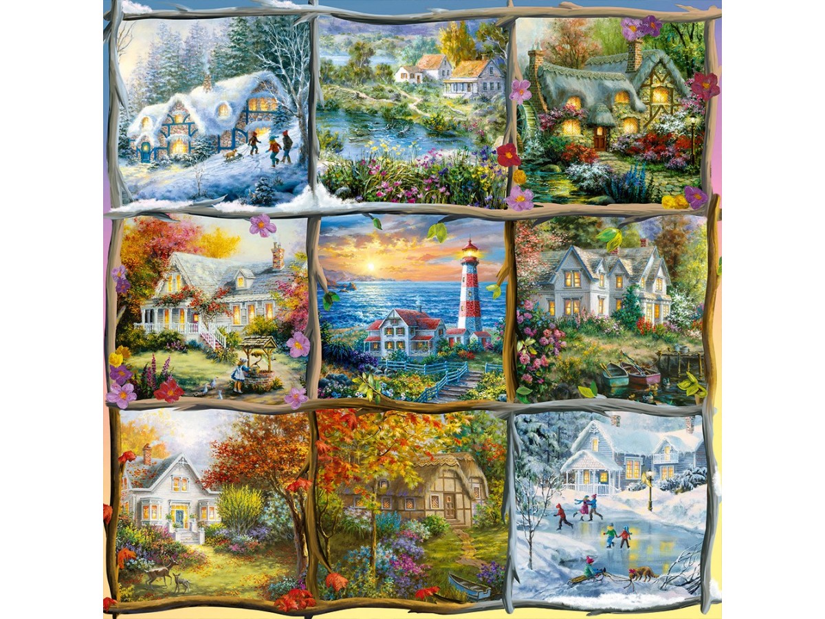 Ilustrația puzzle-ului Alipson cu 1000 de piese, intitulat Seasons Nine Patch, surprinde o colecție variată de scene rurale și peisaje, ilustrând diferite momente ale anotimpurilor. Fiecare cadru transmite un sentiment de liniște și armonie cu natura, redând casuțe pitorești și grădini luxuriante sau înghețate, sub cerul albastru sau acoperite de zăpadă.
