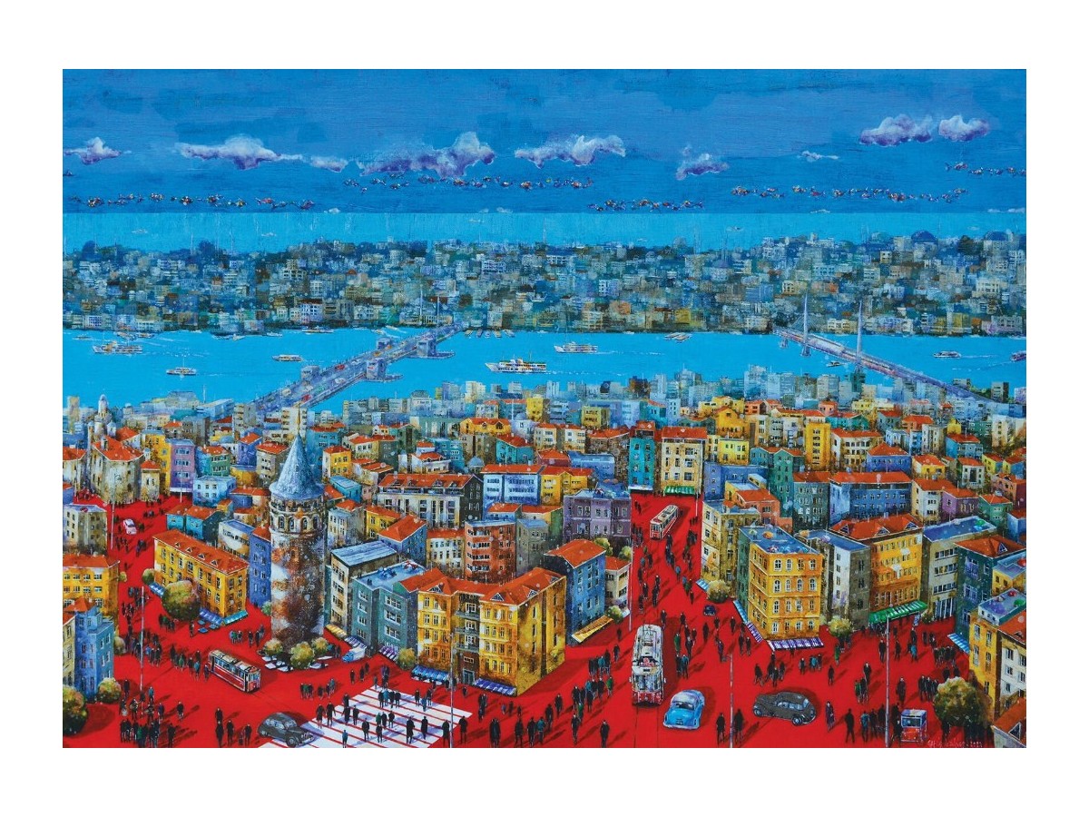 Această ilustrație colorată reprezintă o vedere panoramică asupra orașului Istanbul, capturând esența vibrantă și dinamică a vieții urbane. În prim-plan, piețele aglomerate și străzile animate sunt pline de persoane și vehicule, sugerând vitalitatea orașului. Clădirile tradiționale, pictate într-o gamă variată de culori vii, de la roșu la albastru și galben, contribuie la atmosfera efervescentă a scenei. Fundalul este dominat de un peisaj maritim extins, cu apele Bosforului ce se întind până la orizont, punctate de multe nave. Cerul, ilustrat în tonuri de albastru deschis presărat cu nori subtili și păsări zburând, completează această compoziție bogată și detaliată.