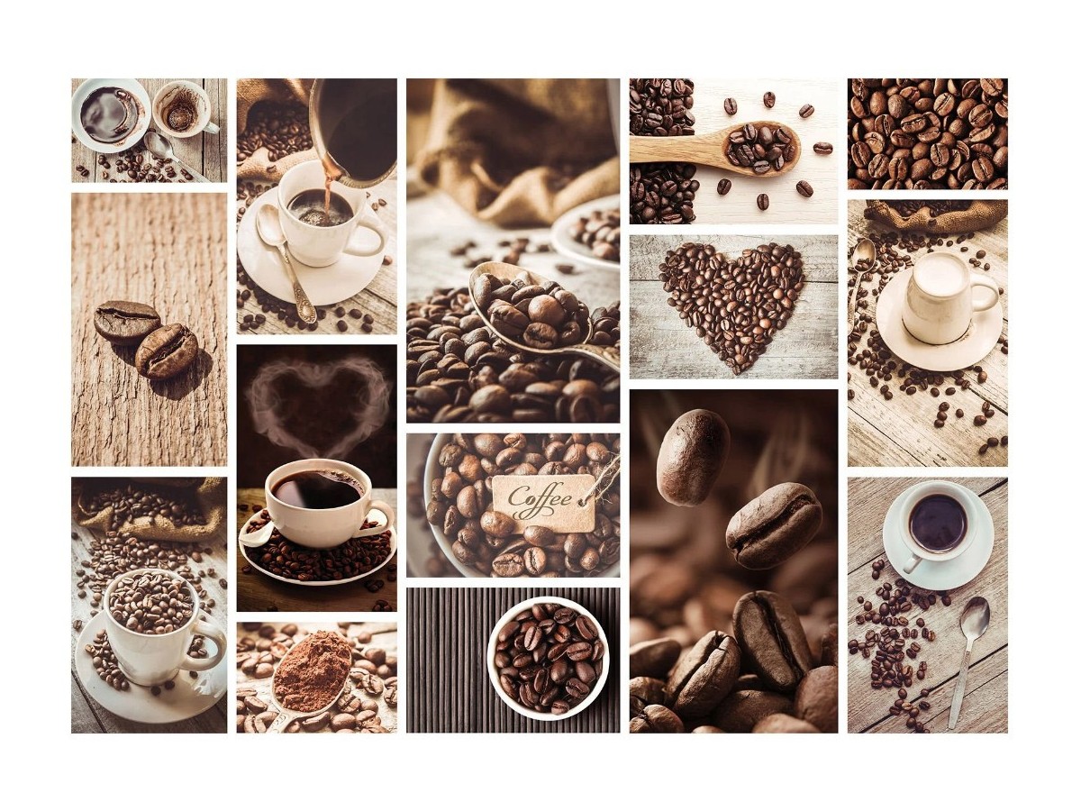 Colajul prezentat redă diverse momente legate de consumul și prepararea cafelei. Imaginea combină fotografii realiste cu elemente decorative, precum boabe de cafea formând o inimă sau așezate artistic în jurul unei cești. Fiecare cadru surprinde o scenă distinctă, de la cești de cafea plasate strategic lângă cărți sau pe un fundal rustic, până la boabe de cafea răspândite pe suprafețe diferite sau boabe întregi evidențiate prin prim-planuri detaliate. Această colecție vizuală captează esența ritualului cafelei, transformând-o într-o experiență estetică plină de texturi și nuanțe ambrate.