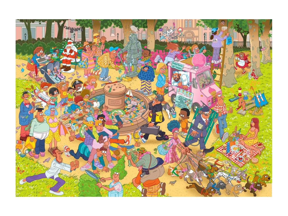 Imaginea puzzle-ului Bluebird cu 1000 de piese Chuckle Park redă o scenă vibrantă dintr-un parc aglomerat, populat cu Număroase personaje și activități diverse. În centrul ei, un grup de copii se bucură de înghețată de la un căruț, în timp ce în jurul lor se află familii și prieteni angajați în picnicuri, lectură sau pur și simplu relaxare pe iarbă. Atmosfera este energică și veselă, iar ilustrația digitală bogată în detalii surprinde și clădirile stilizate ale unui oraș în fundal.