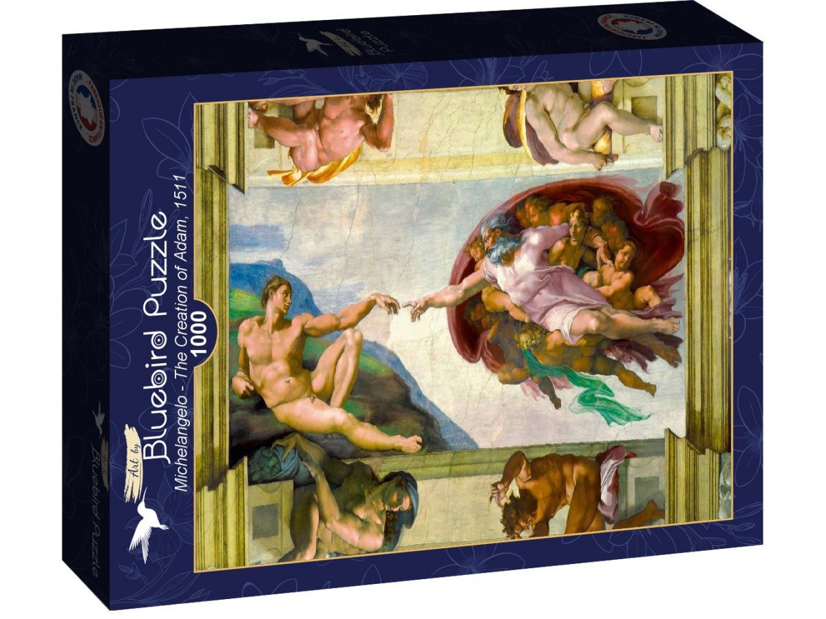 Puzzle-ul Bluebird Puzzle cu 1000 piese reprezintă capodopera lui Michelangelo Buonarroti, 'Crearea lui Adam', pictură iconică din arta Renașterii. Scena surprinde momentul divin în care Dumnezeu întinde mâna către Adam, sub privirile intense ale celor două personaje centrale, înconjurati de îngeri și lumină.