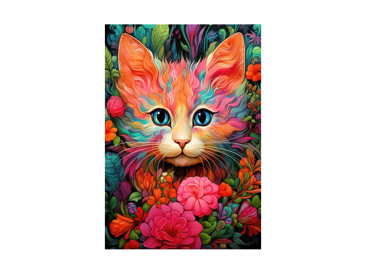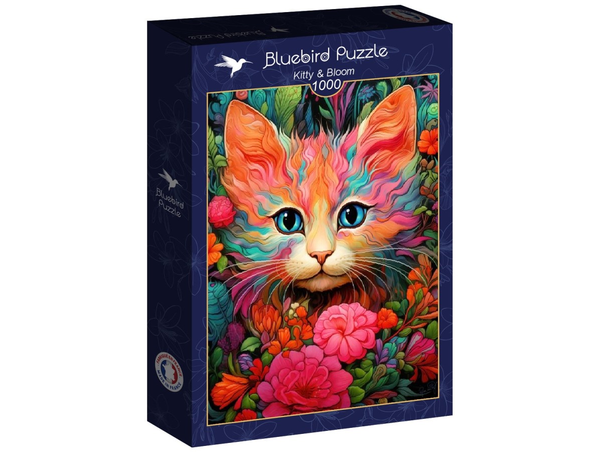Imaginea ilustrează puzzle-ul cu 1000 piese Bluebird - RomantzArt: Kitty & Bloom, destinat adulților, care surprinde un pisoi strălucitor înconjurat de flori vii într-o explozie de culori. Detaliile sunt atent realizate, oferind o perspectivă tridimensională și modernă, sugestivă a artei pop, într-o ilustrație digitală vibrantă.