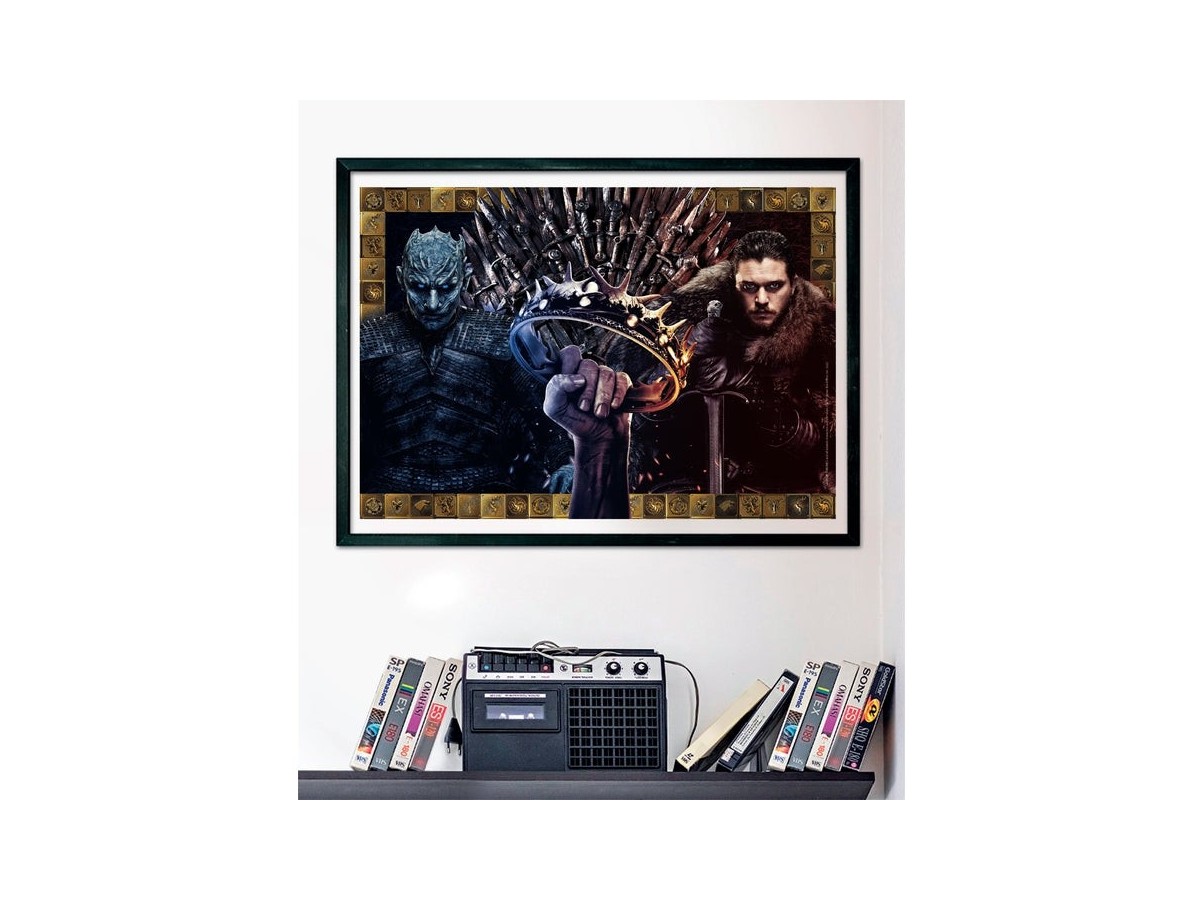 Ilustrația acestui puzzle Clementoni cu 1000 de piese ilustrează doi personaje iconici din seria de televiziune Game of Thrones, Jon Snow și Regele Noptii. Aceștia stau față în față, Jon pe partea stângă, iar în fundal se conturează amenințător Tronul de Fier, format din Număroase săbii îmbinate. Regele Noptii, situat în dreapta, își întinde palma, ținând un scepter care simbolizează puterea sa asupra morților. Culorile predominant întunecate, de albastru și negru, evidențiază aspectul întunecat al scenei, punctat de tonuri metalice ale armelor și scepterului.