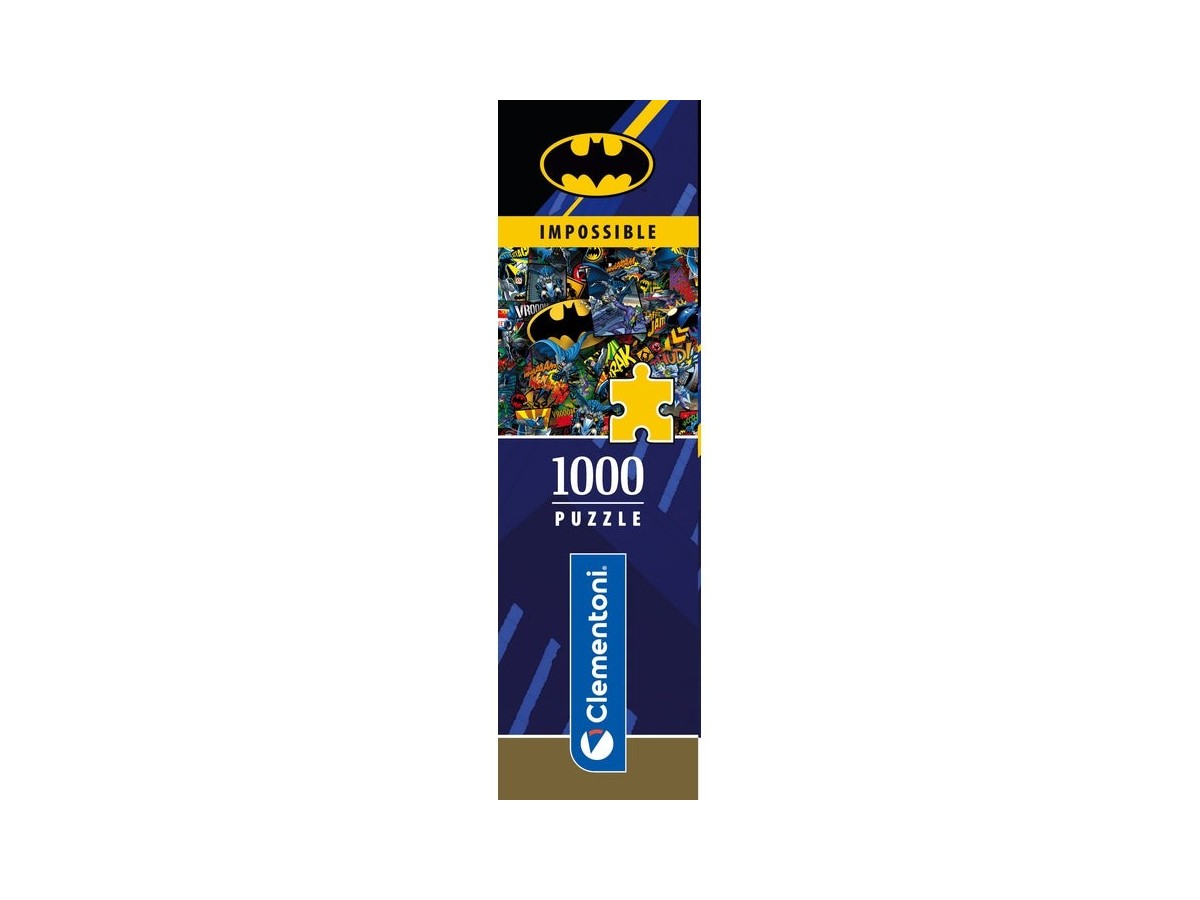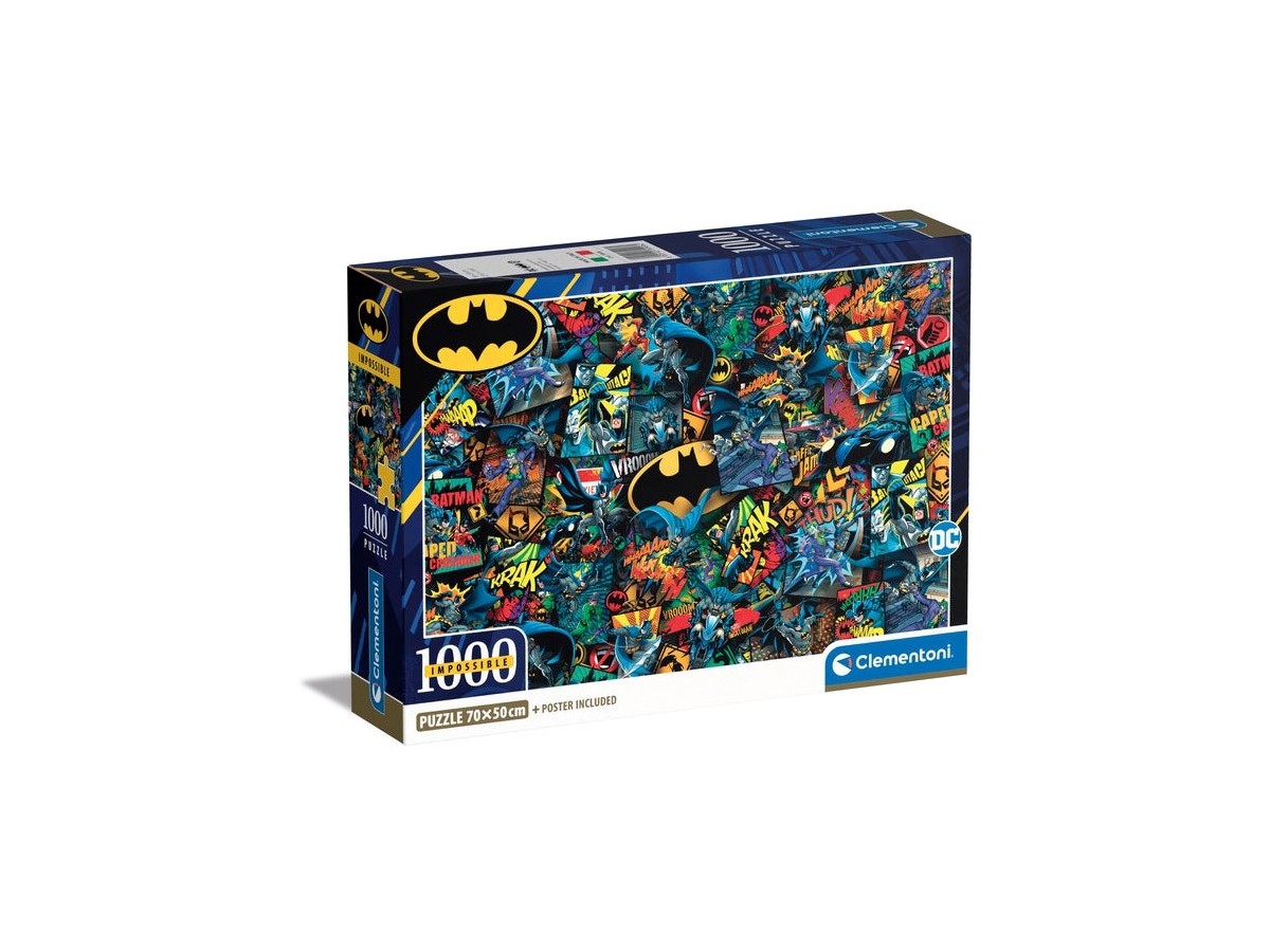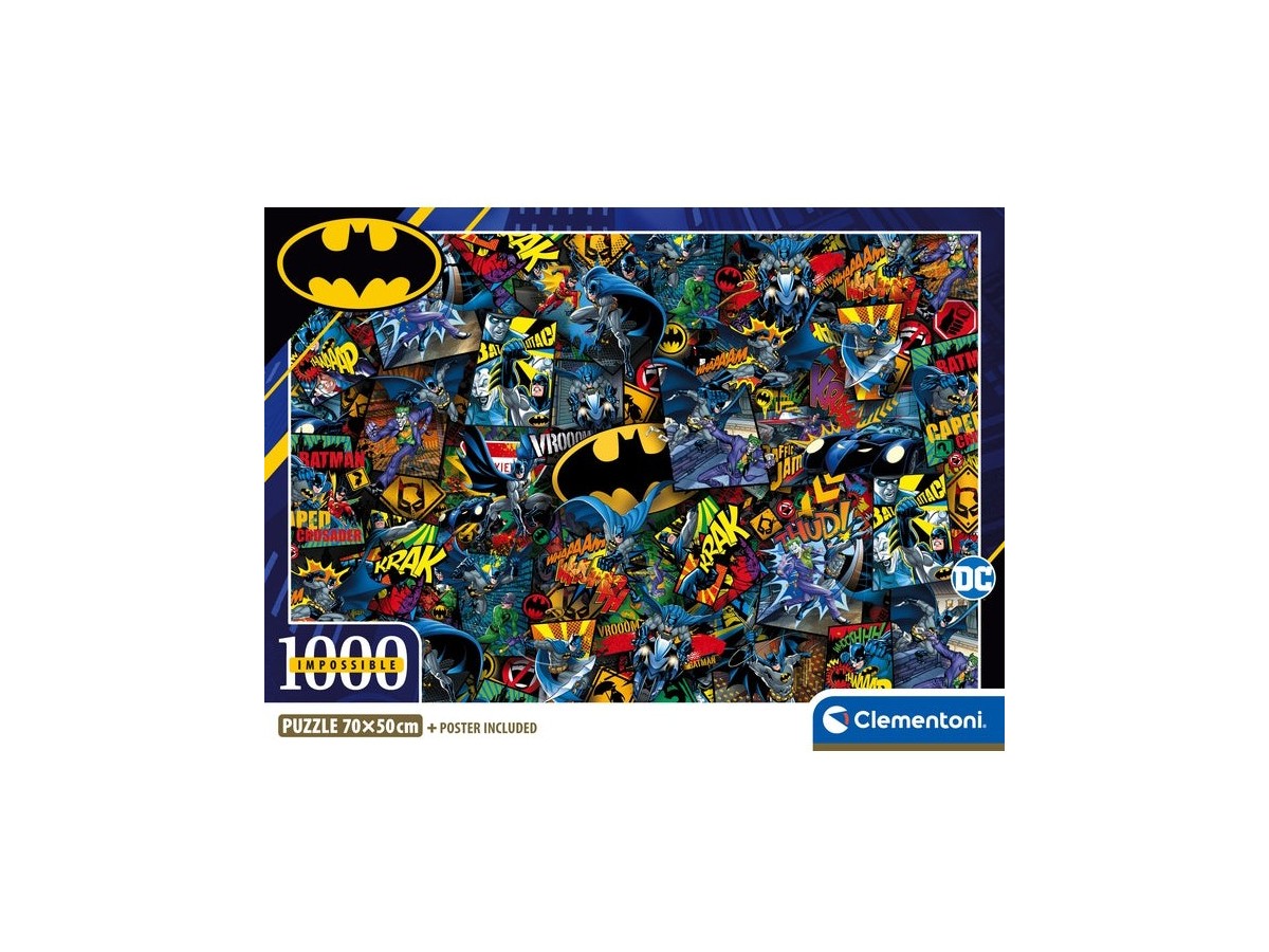 Imaginea puzzle-ului Clementoni 1000 piese - Impossible Batman surprinde o serie de ilustrații vibrante și complexe cu celebrul personaj din franciza DC Comics. Batman este prezent în diferite poziții de luptă, survolând orașul sau confruntându-se cu diverse personaje negative. Culorile intense și texturile dinamice amplifică fiecare scenă, creând un efect vizual captivant, asemănător benzilor desenate.