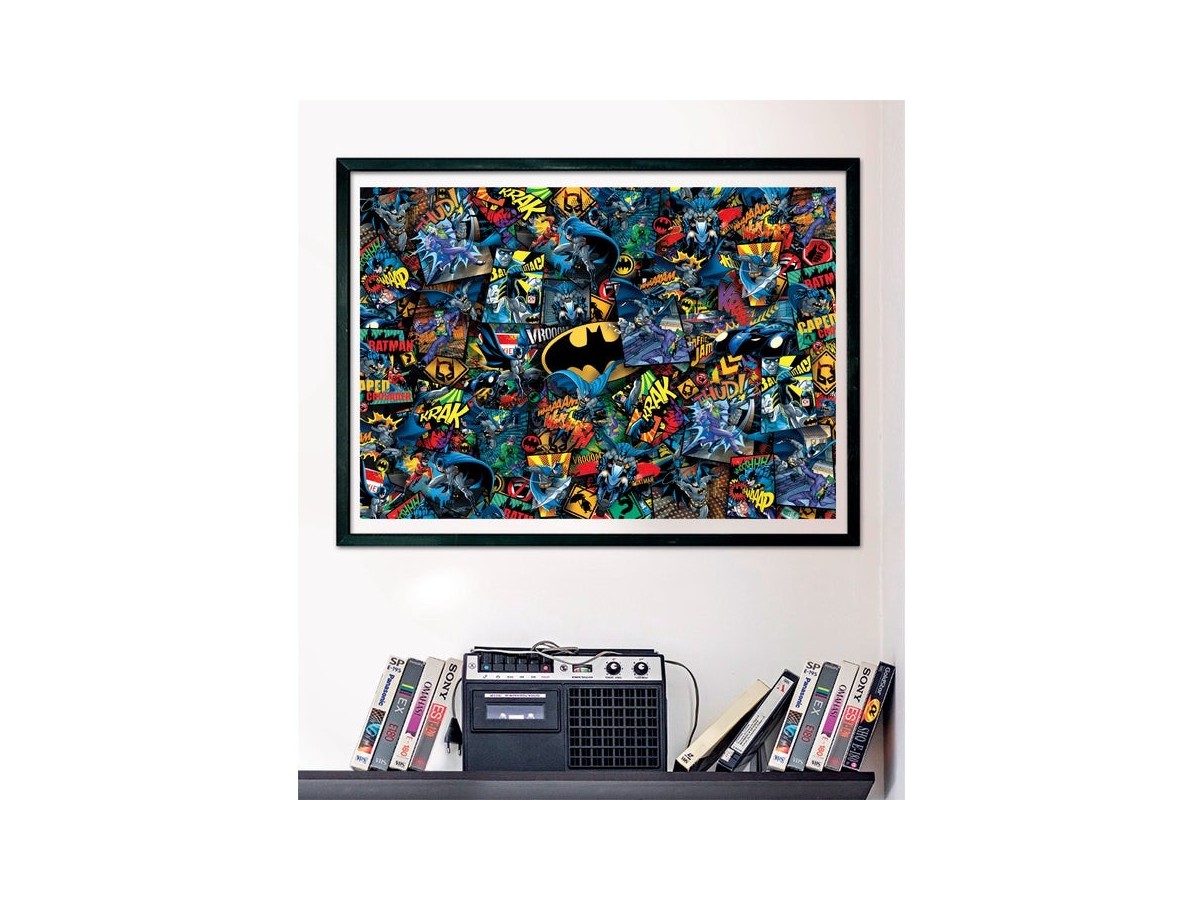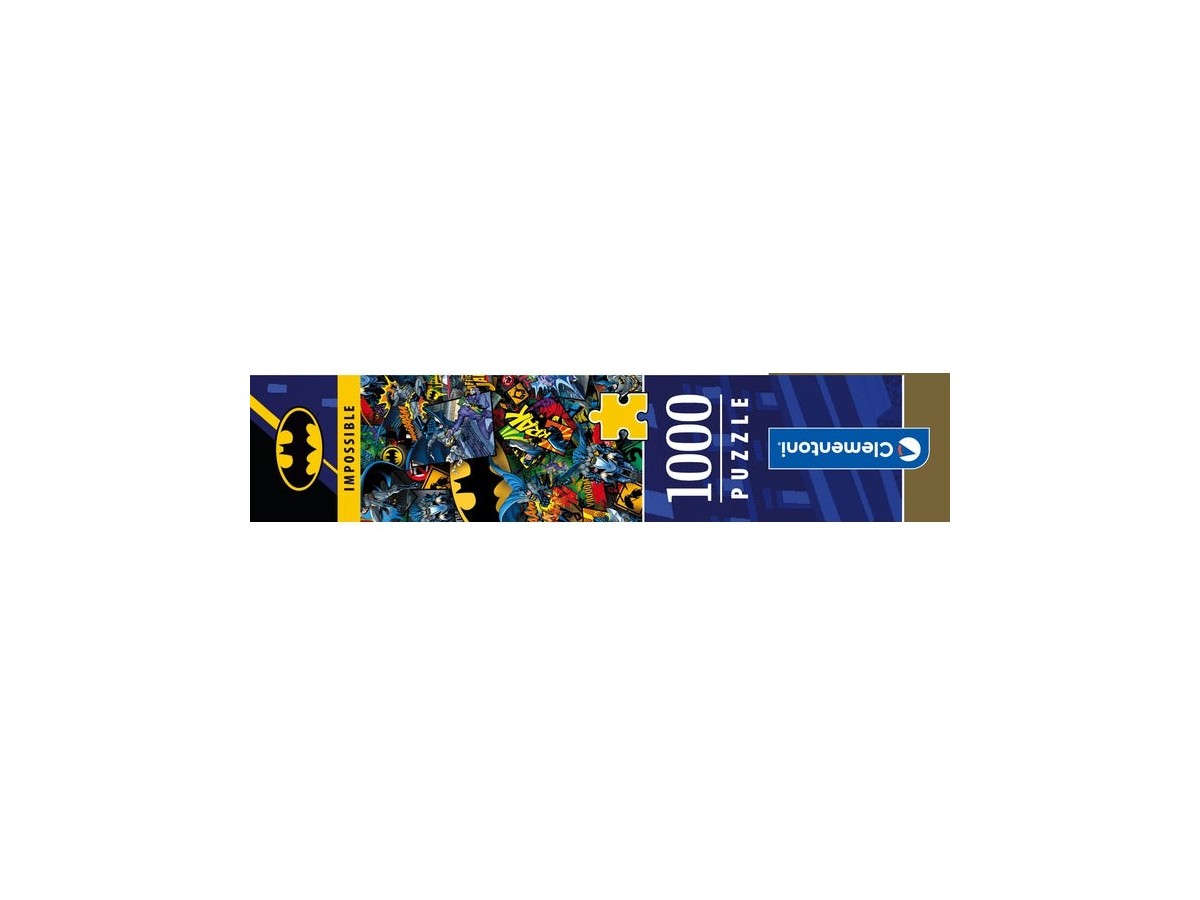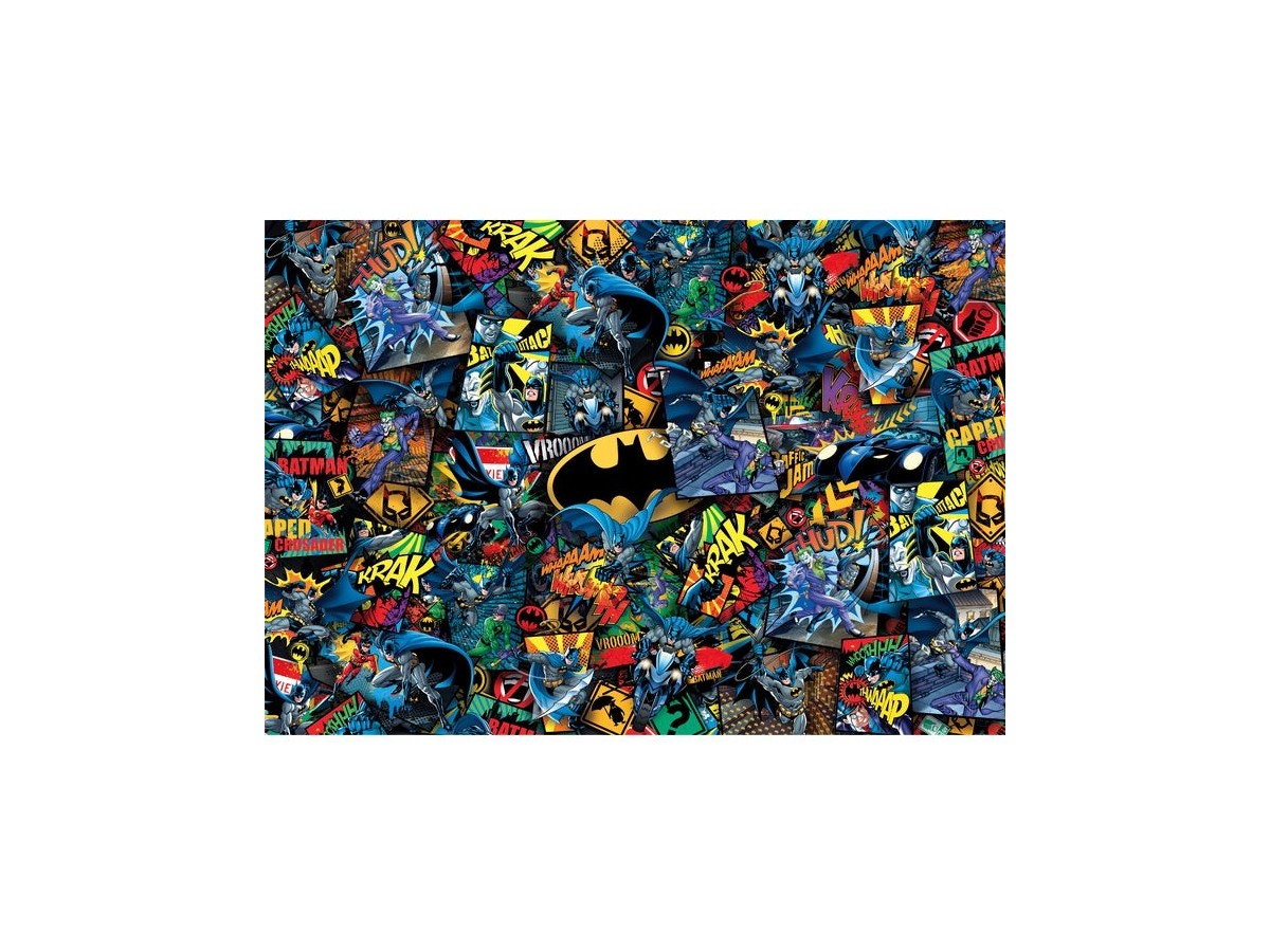 Imaginea puzzle-ului Clementoni 1000 piese - Impossible Batman surprinde o serie de ilustrații vibrante și complexe cu celebrul personaj din franciza DC Comics. Batman este prezent în diferite poziții de luptă, survolând orașul sau confruntându-se cu diverse personaje negative. Culorile intense și texturile dinamice amplifică fiecare scenă, creând un efect vizual captivant, asemănător benzilor desenate.