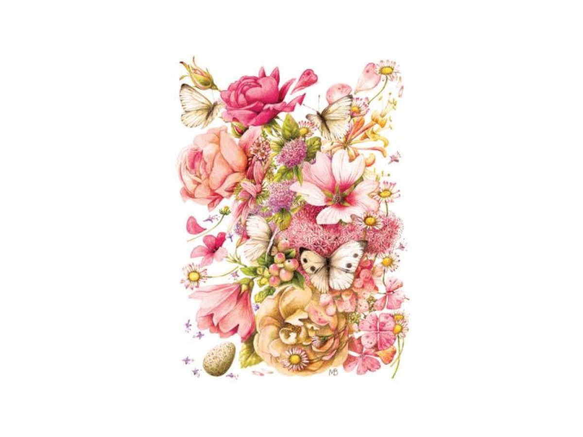 Imaginea prezintă un buchet bogat de flori de diverse soiuri și culori, completat cu inserții delicate de fluturi. Compus din petale roz, roșii și albe, buchetul se distinge printr-un amestec armonios de tonuri calde ce evocă prospețimea și frumusețea naturii. Fluturii cu aripile deschise, colorate în nuanțe de alb și gri, adaugă un element de dinamism și efemeritate începând compoziția. Această ilustrație, desăvârșită în detaliu și culoare, poate fi clasificată ca o pictură în stil realist, oferind o reprezentare idilică și detaliată a unui aranjament floral natural.