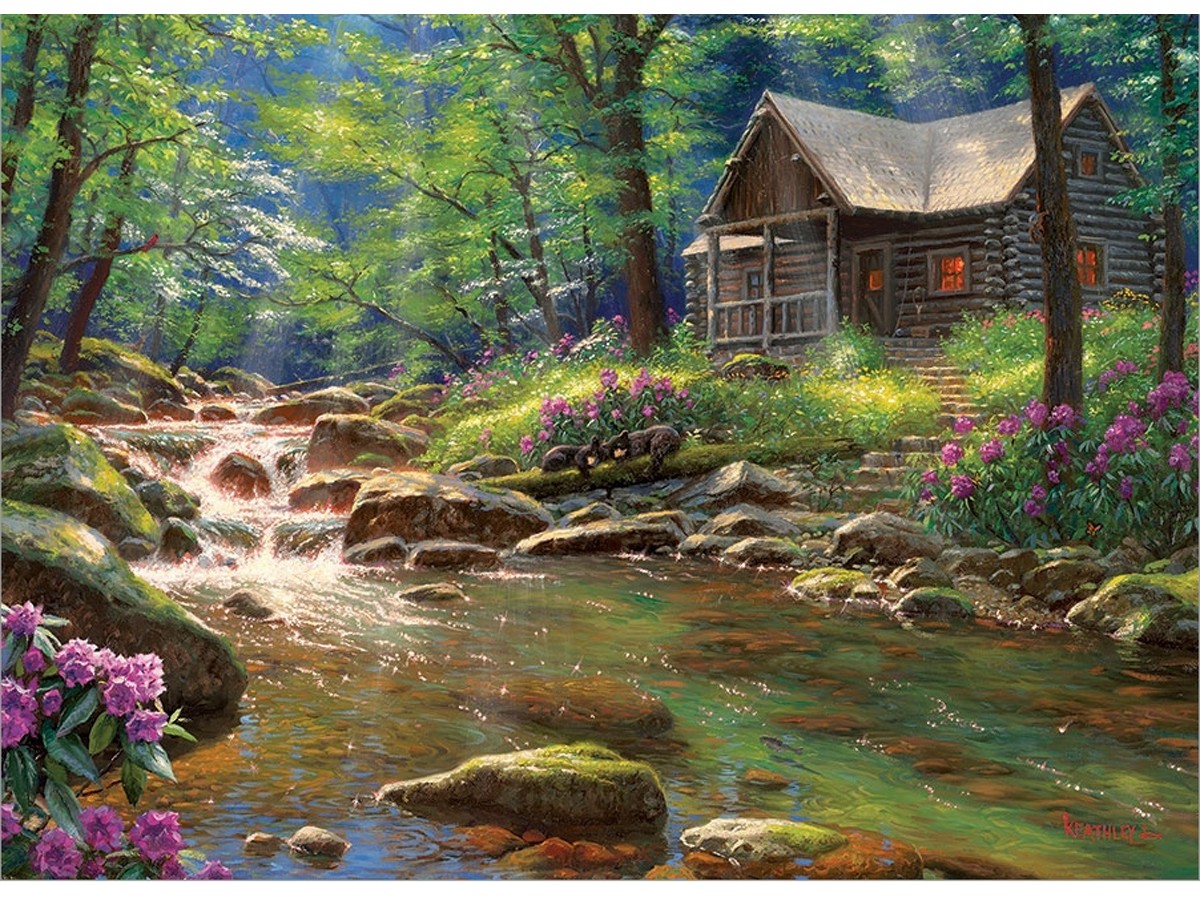 Scena ilustrată în imagine redă o cabană rustică situată pe malul unui râu tumultuos, într-un peisaj bogat în vegetație. Construcția din lemn, cu acoperiș din șindrilă, pare să fie învăluită în serenitatea lumii naturale, fiind înconjurată de copaci înalți și diferite specii de flori sălbatice. Râul ce curge în fața cabanei are ape cristaline, în care se pot observa pietrele de râu bine lucite de ape. Lumina soarelui străbate prin frunziș, creând pete de lumină și umbră pe solul pădurii, ce conferă scenei o notă de mister și frumusețe liniștită. Este o pictură care capturează esența unui refugiu perfect în sălbăticie, un loc unde natura și omul conviețuiesc în armonie.