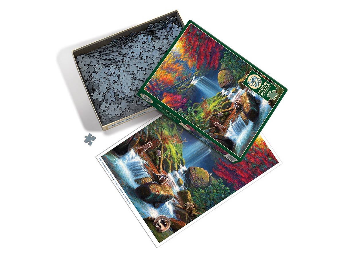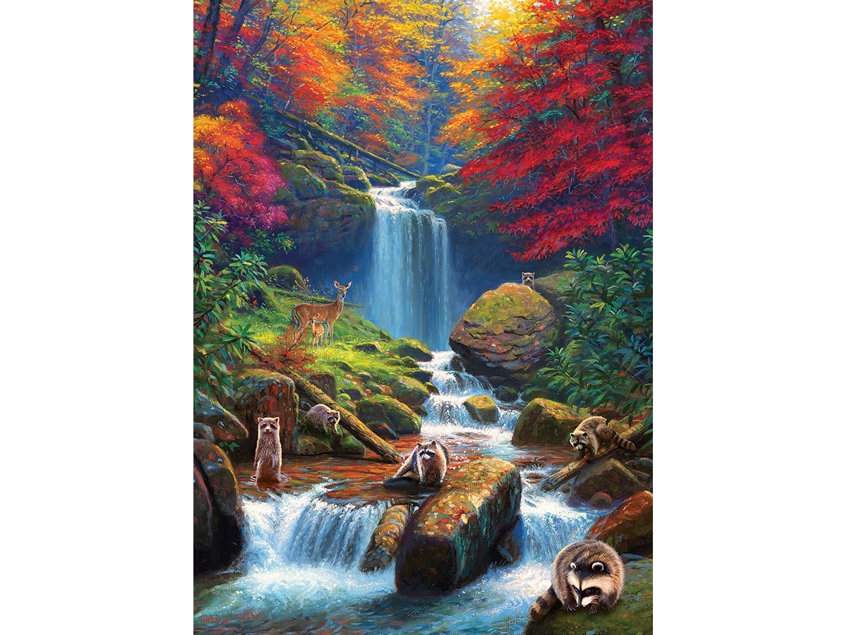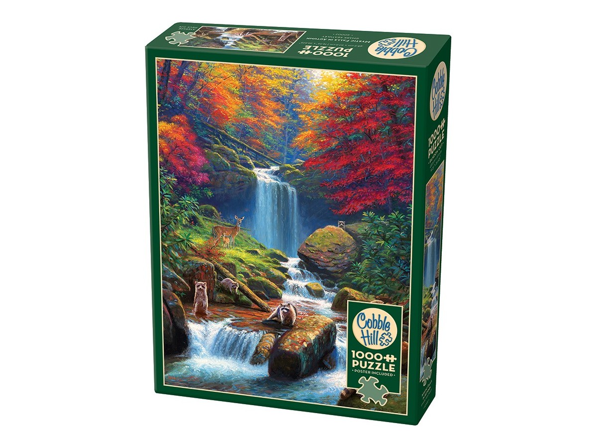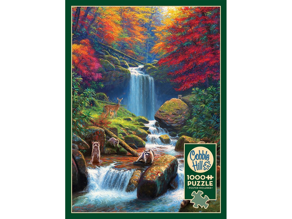 Imaginea acestui puzzle cu 1000 de piese Cobble Hill - Mystic Falls in Autumn surprinde frumusețea unei cascade naturale în mijlocul unei păduri de toamnă. Apa curge în mai multe niveluri stâncoase, formând un mic lac la baza cascadei. Vegetația din jur este în culori intense de roșu, portocaliu, galben și verde, reflectând schimbarea sezonului către toamnă. Scene cu căprioare și castori aduc dinamism și viață imaginii, completând peisajul natural. Iluminarea naturală creează reflexii strălucitoare pe suprafața apei și contrast puternic cu zonele umbrite din pădure.