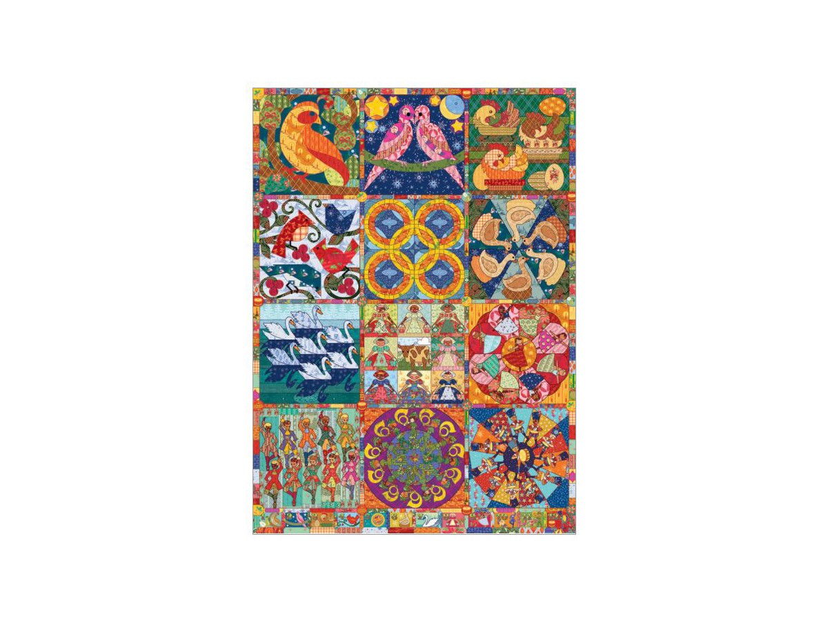 Imaginea prezentată pe puzzle-ul Cobble Hill cu 1000 de piese - Twelve Days of Christmas Quilt - este un colaj vibrant de ilustrații variate, fiecare ilustrând motive și simboluri asociate sărbătorii Crăciunului și iernii. Un cadru surprinde o pereche de păsări exotice, în culori vii de roșu și portocaliu, pe un fundal verde bogat. Altă scenă prezintă patinatori pe gheață, într-un peisaj de iarnă cu nuanțe pastelate de albastru și alb, iar o altă imagine detaliază un desen complex de fulgi de nea în albastru intens și alb.
