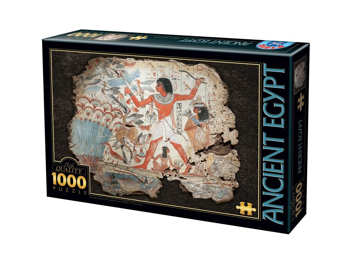 Imaginea acestui puzzle cu 1000 piese D-Toys - Ancient Egypt (Dtoys-74843) prezintă o scenă din Egiptul Antic, ilustrând o frescă murală tipică acelei ere. Un faraon este în centrul atenției, executând un ritual de vânătoare sau de luptă, înconjurat de diverse simboluri egiptene, hieroglife și figuri de zei egipteni. Purta coroana tradițională și ornamente specifice, fiind învăluit într-o aură de prestigiu și putere, pe un fundal detaliat cu elemente naturale și arhitecturale specifice peisajului egiptean.