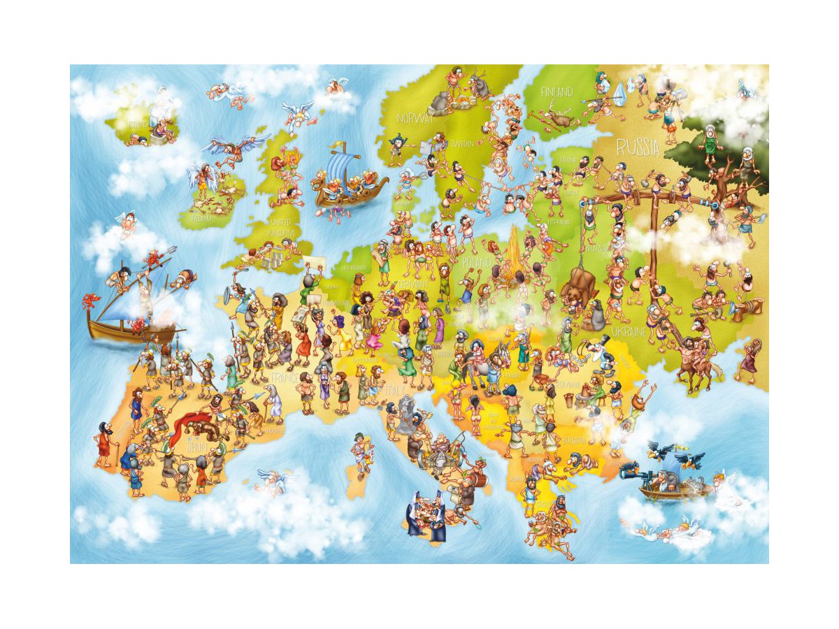 Imaginea ilustrează o hartă stilizată și colorată a Europei, populată cu diverse personaje și activități reprezentative pentru diferite culturi și țări europene. Fiecare țară este marcată printr-o serie de simboluri culturale, istorice sau tradiționale, cum ar fi costume naționale, animale caracteristice sau clădiri emblematice. Scena este animată de personaje angajate în diferite activități, precum dansuri tradiționale, lupte sau interacțiuni joviale, oferind o viziune plină de viață și culoare. Această hartă nu reprezintă o geografie precisă, ci mai degrabă o interpretare artistică și umoristică a continentului european. Per total, imaginea este o ilustrație bogată în detalii, ce folosește un stil desenat, plin de umor și expresivitate.