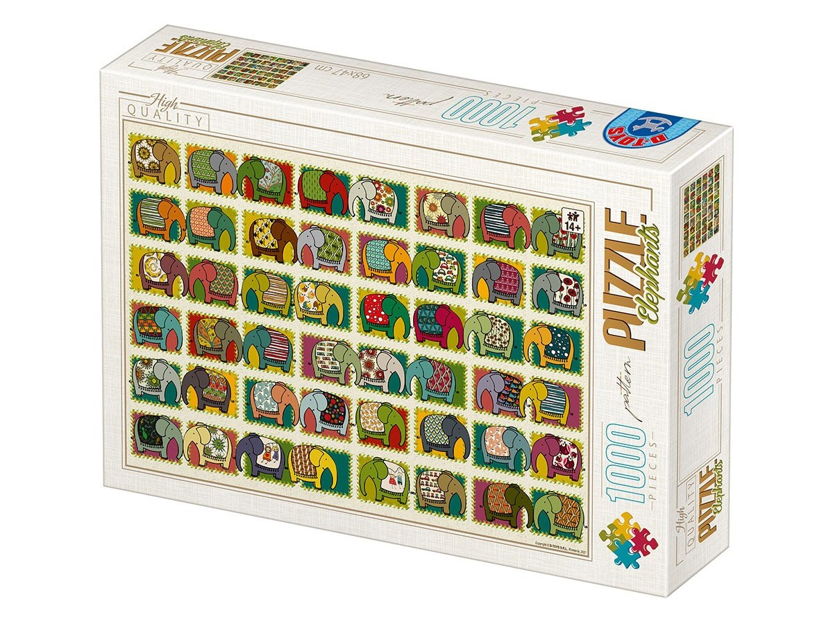 Imaginea acestui puzzle cu 1000 de piese de la brandul D-Toys prezintă o serie de elefanți colorați, fiecare cu modele ornamentale unice pe corp. Aceștia sunt distribuiți în mai multe blocuri, fiecare bloc afișând elefanți cu diverse nuanțe, inclusiv albastru, roșu, verde și galben, creând un contrast vizual plăcut. Fiecare elefant este decorat în mod distinct, cu modele care variază de la printuri florale la forme geometrice. Compoziția vibrantă și detaliată a ilustrației evocă o atmosferă veselă și energetică, fiecare elefant având o postură și expresie care pare să îi confere personalitate.