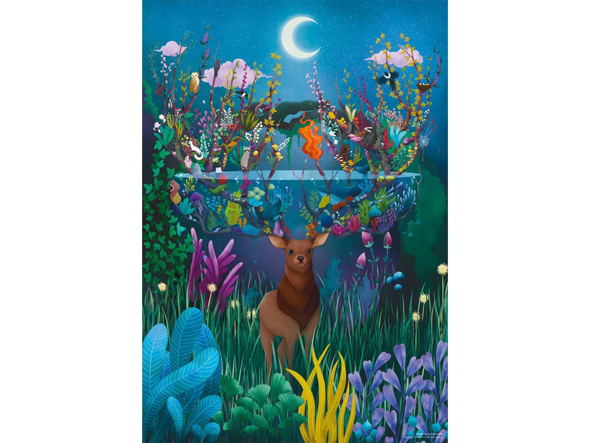 Imaginea acestui puzzle D-Toys cu 1000 de piese, creat de Demeter Brigi, ilustrează o scenă fantastico-naturală captivantă. În centrul compoziției se află un cerb cu privire calmă și coarne decorate cu flori și plante acvatice, susținând un ecosistem marin suspendat. Fundalul luminat de lună completează tabloul vibrant și detaliat al naturii.