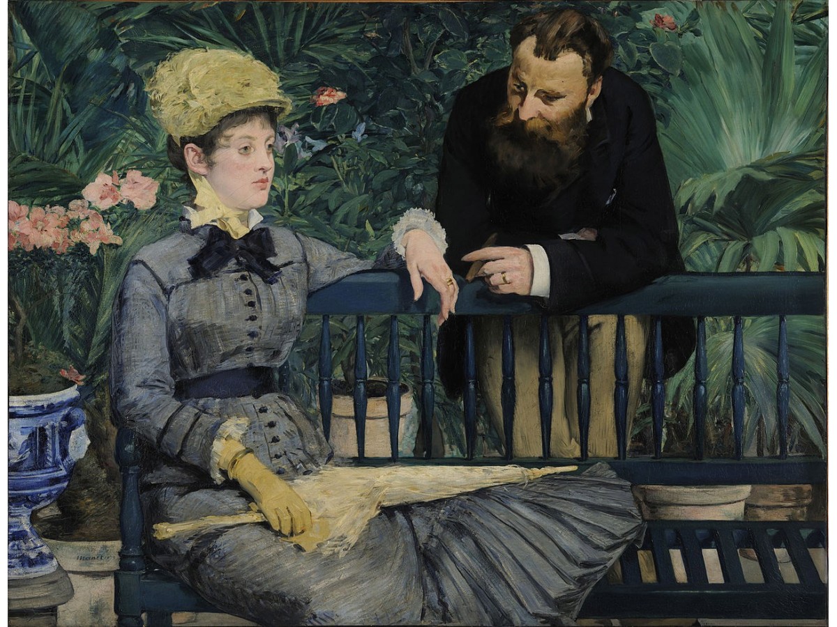 Această pictură realizată de Édouard Manet, intitulată 'În Conservator', ilustrează doi adulți, un bărbat și o femeie, așezați pe o bancă înconjurată de vegetație luxuriantă. Femeia, situată în fața imaginii, poartă o rochie lungă de culoare gri-albastră și un corset strâns, caracteristic epocii, completat de o pălărie elegantă de vară. Bărbatul, ce apare în plan secund, este îmbrăcat într-un costum închis la culoare cu barbă lungă și bine îngrijită. Amândoi par să fie implicați într-o conversație serioasă, schițând gesturi subtile cu mâinile. Fundalul este dominat de plante verzi și un vaz mare de porțelan, adăugând un sentiment de intimitate și izolare de restul lumii.