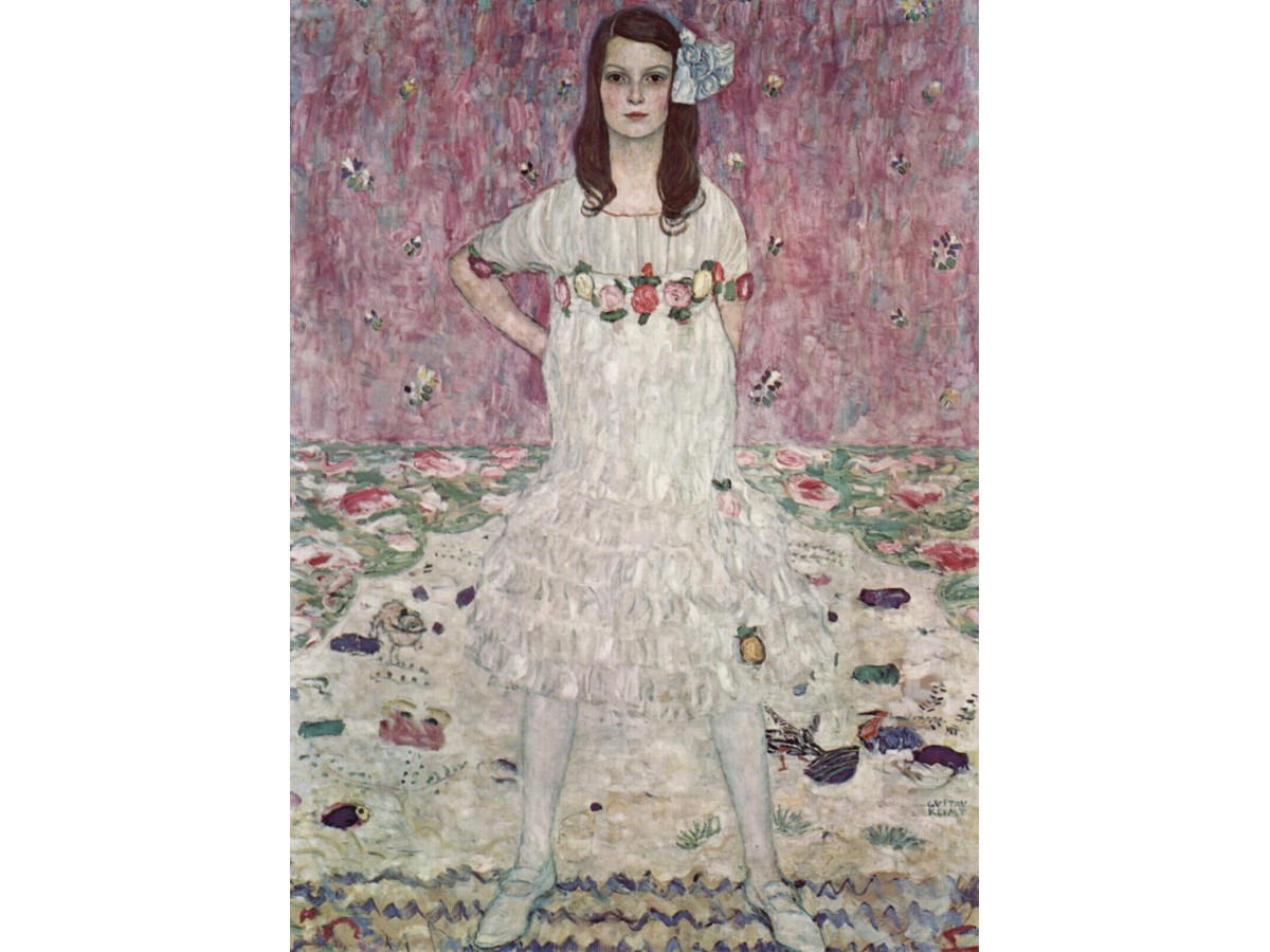 Această pictură realizată de Gustav Klimt, intitulată 'Mada Primavesi', surprinde o tânără fetiță îmbrăcată într-o rochie albă cu volane, stând în picioare pe un covor floral extins. Contextul operei este inundat de un fundal roz, presărat cu diverse flori stilizate și două păsări la picioarele fetiței. Stilul artistic este recunoscut ca fiind partea târzie a art nouveau-ului, caracterizat prin utilizarea liniilor curbe și a unor motive naturale decorative în manieră luxuriantă. Fetița privind direct spre privitor ridică impresia de seninătate și contemplare, și este accentuată de paleta de culori pastelate utilizate predominant în lucrare.