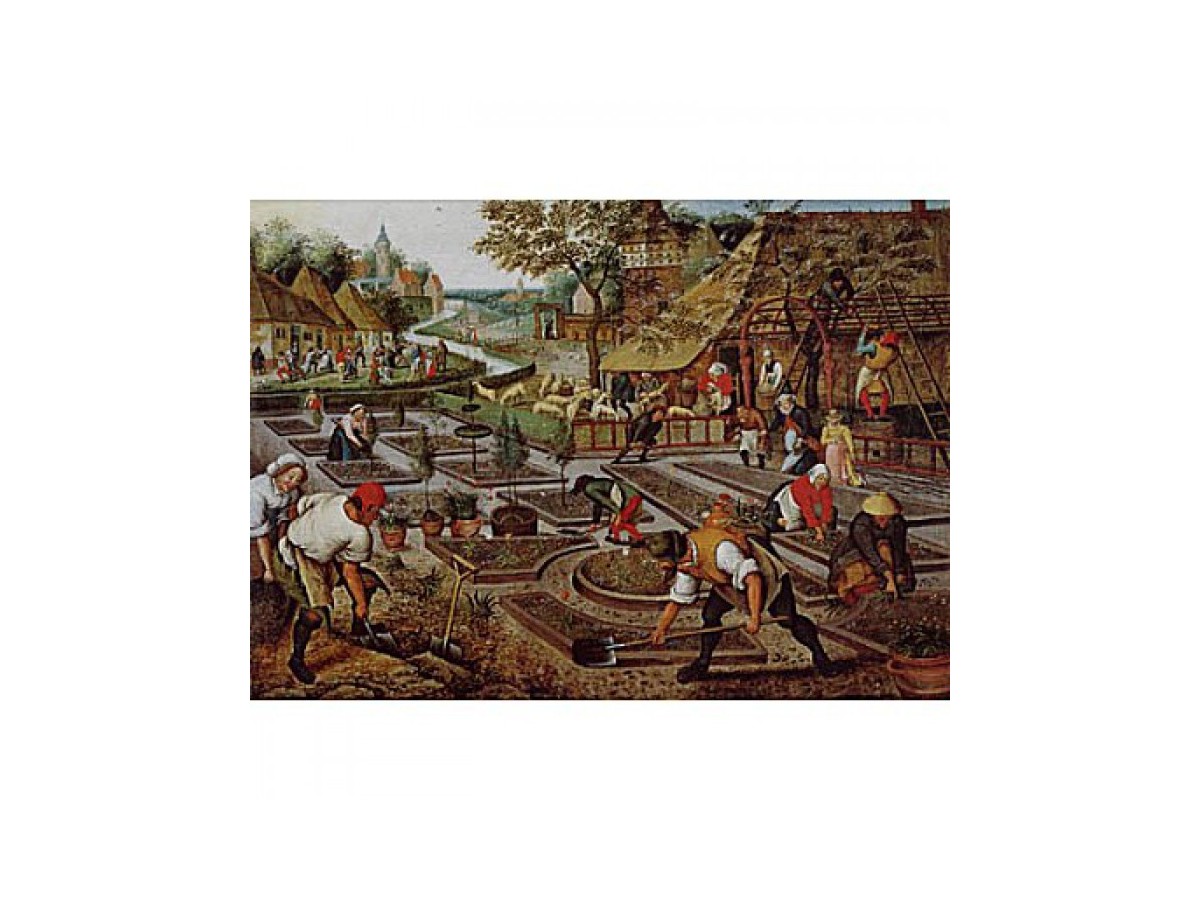 Această pictură realizată de Pieter Bruegel, intitulată 'Spring', surprinde o scenă tipic rurală, plină de viață și activitate. Observăm în prim-plan mai mulți lucrători agricoli angajați în diverse activități de primăvară, precum aratul, plantarea și îngrijirea grădinilor. Scenele îmbină activitate umană intensă cu detaliile pitorești ale naturii și arhitecturii rurale. În fundal, un râu serpuit divide peisajul, pe maluri fiind amplasate case rustice cu acoperișuri de paie, iar în depărtare se zăresc dealuri împădurite sub un cer senin.