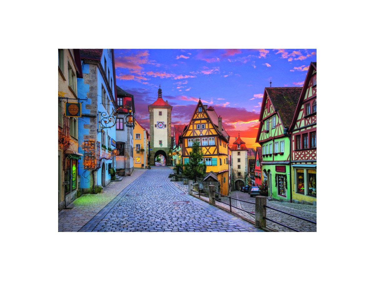 Acest puzzle D-Toys cu 1000 de piese redă o ilustrație digitală a unei străzi pitorești din Rothenburg, Germania. Clădirile tradiționale germane, cu acoperișuri înalte și ferestre în arcadă, sunt iluminate de lumina caldă a amurgului. Strada pietruită se întinde într-o curbă ușoară, condusă de un turn impunător care domină peisajul la capătul său. Cerul diafan, presărat cu nuanțe de roz și albastru, completează tabloul dramatic al acestei scene.