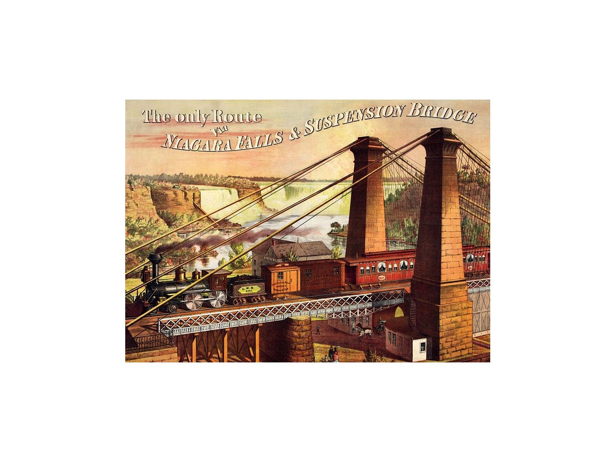 Această ilustrație în stil realist surprinde un scenariu vibrant și istoric, concentrându-se pe Căderea de Apă Niagara și podul suspendat ce leagă două maluri. În centrul compoziției, un tren vechi, alimentat probabil pe bază de cărbuni, traversează podul suspendat, evidențiind modul de transport al epocii. Pe fundal, cascadele Niagara se revarsă într-un spectacol impresionant de apă și spumă, creând un contrast puternic cu structura industrială a podului. Cerul este senin, posibil la sfârșitul unei zile calme, ce adaugă o notă de liniște scenariului plin de forfotă tehnică și naturală.