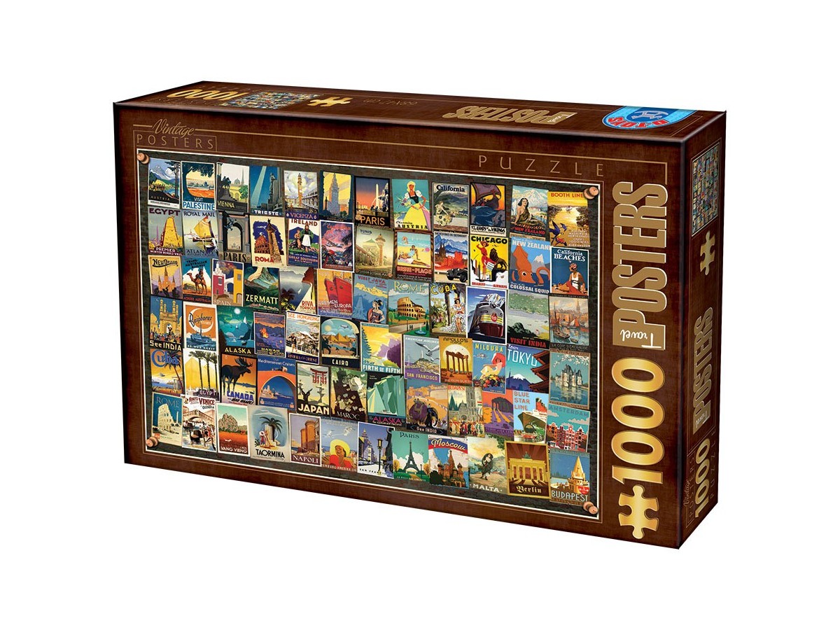 Imaginea acestui puzzle cu 1000 de piese D-Toys - Vintage Collage - Travel (Dtoys-74621) este un colaj ce cuprinde mai multe postere de călătorie, fiecare ilustrând diverse destinații din întreaga lume. Aceste postere prezintă imagini iconice și cunoscute ale unor orașe mari și atracții turistice precum New York, Paris și Tokyo, realizate într-un stil retro ce recrează atmosfera specifică fiecărui loc, de la peisaje urbane la monumente celebre. Culorile vibrante predominante sunt albastru, roșu și galben.