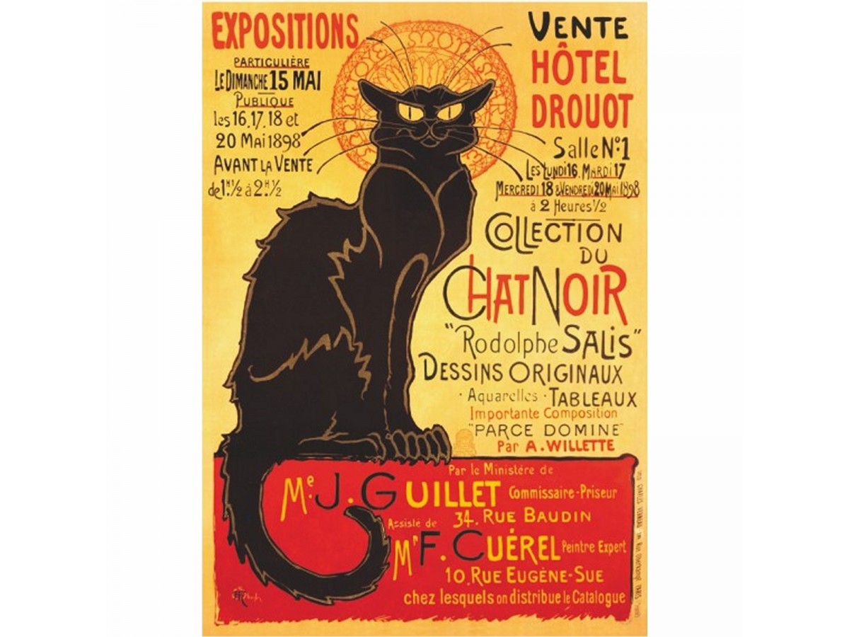 Imaginea acestui puzzle de 1000 de piese D-Toys - Vintage Posters: Exhibitions (DToys-69566) prezintă un afiș vintage de culoare predominant galbenă, creat în stilul Art Nouveau. Acesta anunță o vânzare de artă ce avea loc la 'Hotel Drouot' pe 3 mai și 7 iunie 1898. În centrul afișului se remarcă o reprezentare stilizată a unui pisoi negru, cu ochii mari, galbeni, strălucitori, stand pe fundalul unei luni pline, viu colorată. Pisica pare să privească direct spre privitor, oferind o expresie enigmatică. Textul de pe afiș oferă detalii despre eveniment, inclusiv date și locații, precum și numele unei serii de persoane asociate cu vânzarea, sugerând importanța și magnitudinea evenimentului.