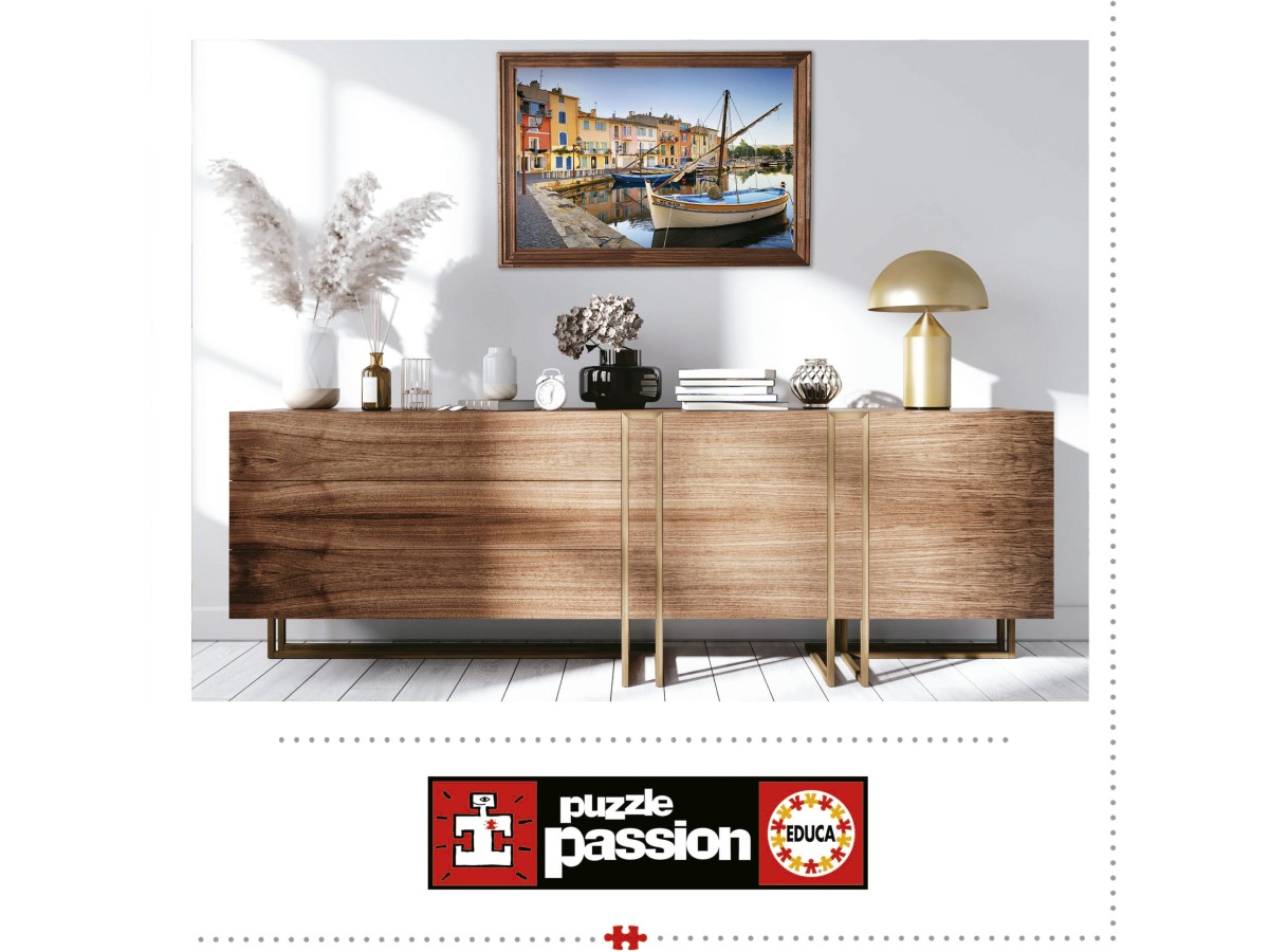 Imaginea prezentată în puzzle-ul Harbour In Martigues. Provence de la brandul Educa este o pictură în stil realist care surprinde viața de zi cu zi într-un port mic din Martigues, Provence. O barcă cu pânze tradițională stă ancorată în apele liniștite ale canalului ce străbate orașul, înconjurată de clădiri colorate în nuanțe vii de galben, roz, albastru și portocaliu, reflectând arhitectura specifică a regiunii Provence. Atmosfera calmă și idilică oferă o privire asupra vieții cotidiene într-un oraș de coastă din sudul Franței.