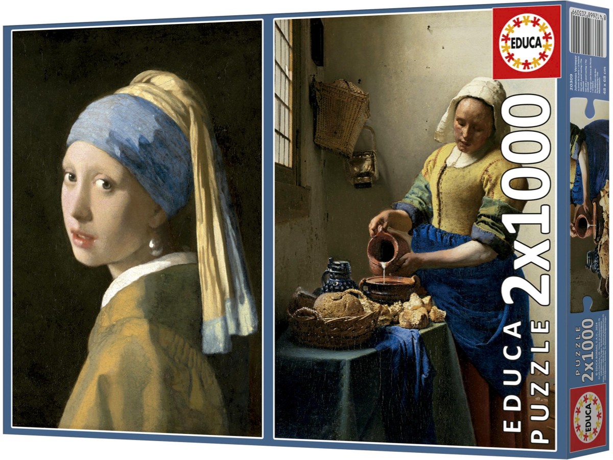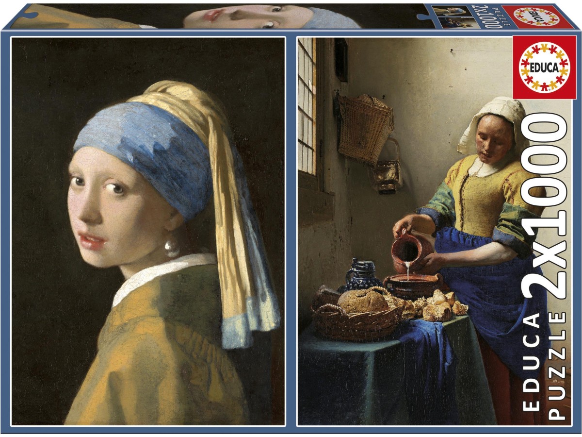 Imaginea acestui puzzle cu 1000 de piese Educa reprezintă două opere de artă semnate de Johannes Vermeer. Prima pictură, 'Fata cu cercelul de perlă', surprinde un portret al unei tinere cu un turban albastru și un cercel strălucitor de perlă. Privirea directă și expresia calmă a fetei atrag privitorul. A doua lucrare, 'Lăptăreasa', ilustrează o femeie care toarnă laptelul într-o încăpere întunecată. Detaliile precum vasele de ceramică și pâinile de pe masă sunt redațe cu o atenție meticuloasă.