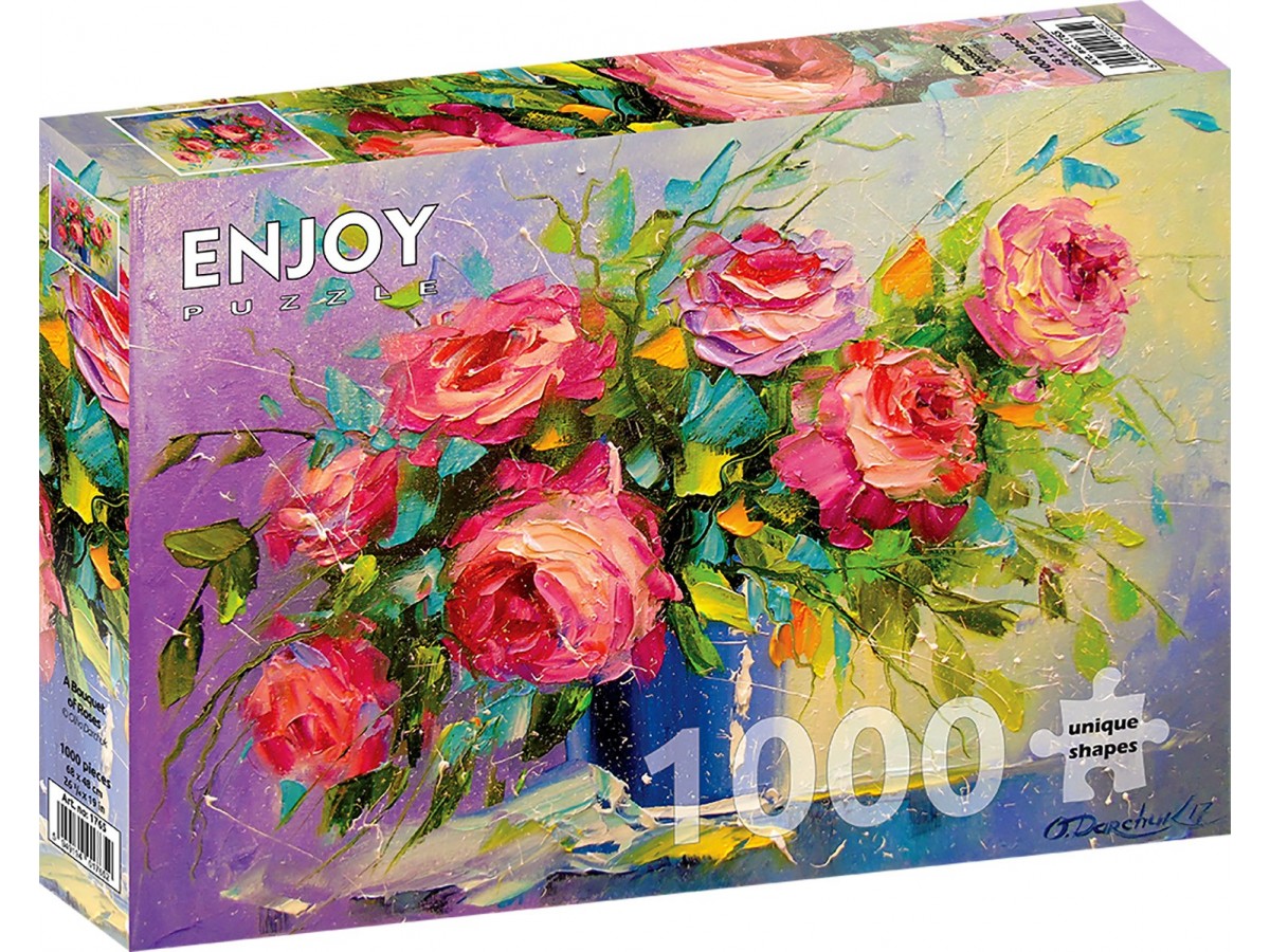 Puzzle-ul Enjoy - A Bouquet of Roses este format din 1000 de piese și are dimensiunile de 68 x 48 cm. Acesta este destinat exclusiv adulților, oferindu-le o experiență de relaxare și concentrare în timp ce reconstituie imaginea cu buchetul de trandafiri. Brandul Enjoy este cunoscut pentru calitatea superioară a puzzle-urilor sale, fiecare piesă fiind tăiată cu precizie pentru a se potrivi perfect și a crea o imagine finală impresionantă.