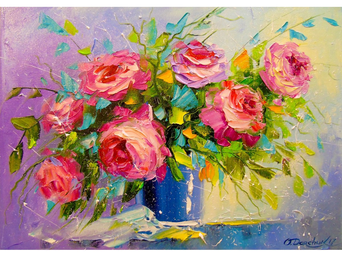 Această pictură în stil impresionist infățișează un buchet generos de trandafiri în nuanțe vibrante de roz și roșu, așezat într-un vas simplu, albastru. Fondul lucrării este realizat în tonuri calde de galben, violet și albastru, creând un contrast plăcut cu culorile intense ale florilor. Pictura emană o senzație de prospețime și naturalețe, trandafirii fiind redați într-o manieră relativ liberă, cu tușe largi și expresive de culoare. Se remarcă, de asemenea, câteva pete de culoare verde, reprezentând frunzele care îmbogățesc compoziția și adaugă profunzime și textură imaginii.