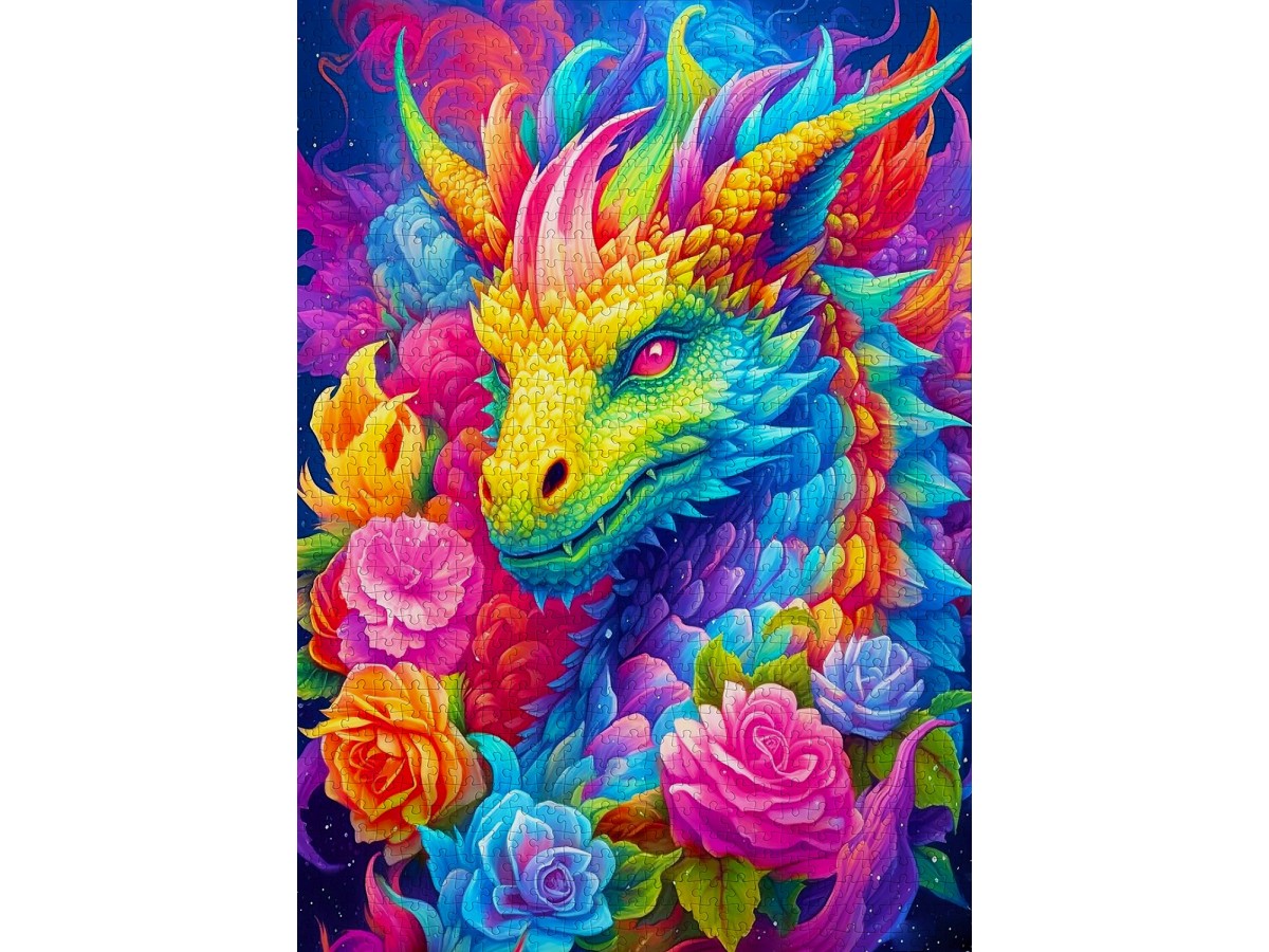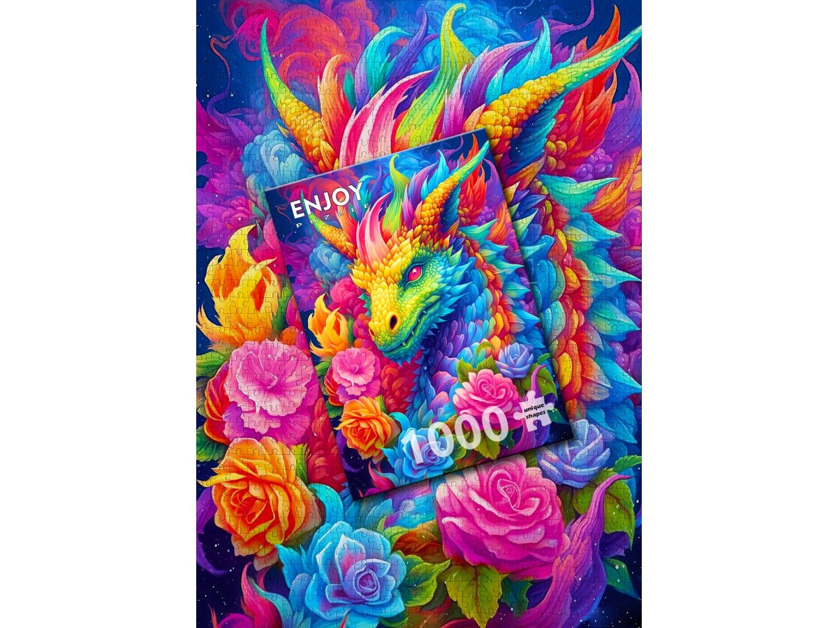 Acest puzzle cu 1000 de piese de la brandul Enjoy redă o ilustrație digitală captivantă a unui dragon vibrant, înconjurat de flori colorate. Dragonul cu solzi în nuanțe de verde, albastru și galben ocupă centrul compoziției, privind intens spre privitor cu un ochi roșu strălucitor, în timp ce florile variate în tonuri de roz, roșu, albastru și violet creează un contrast frumos. Detaliile minuțioase ale solzilor și petalelor sunt evidențiate prin nuanțe și umbre bine definite, contribuind la impactul vizual puternic al ilustrației.