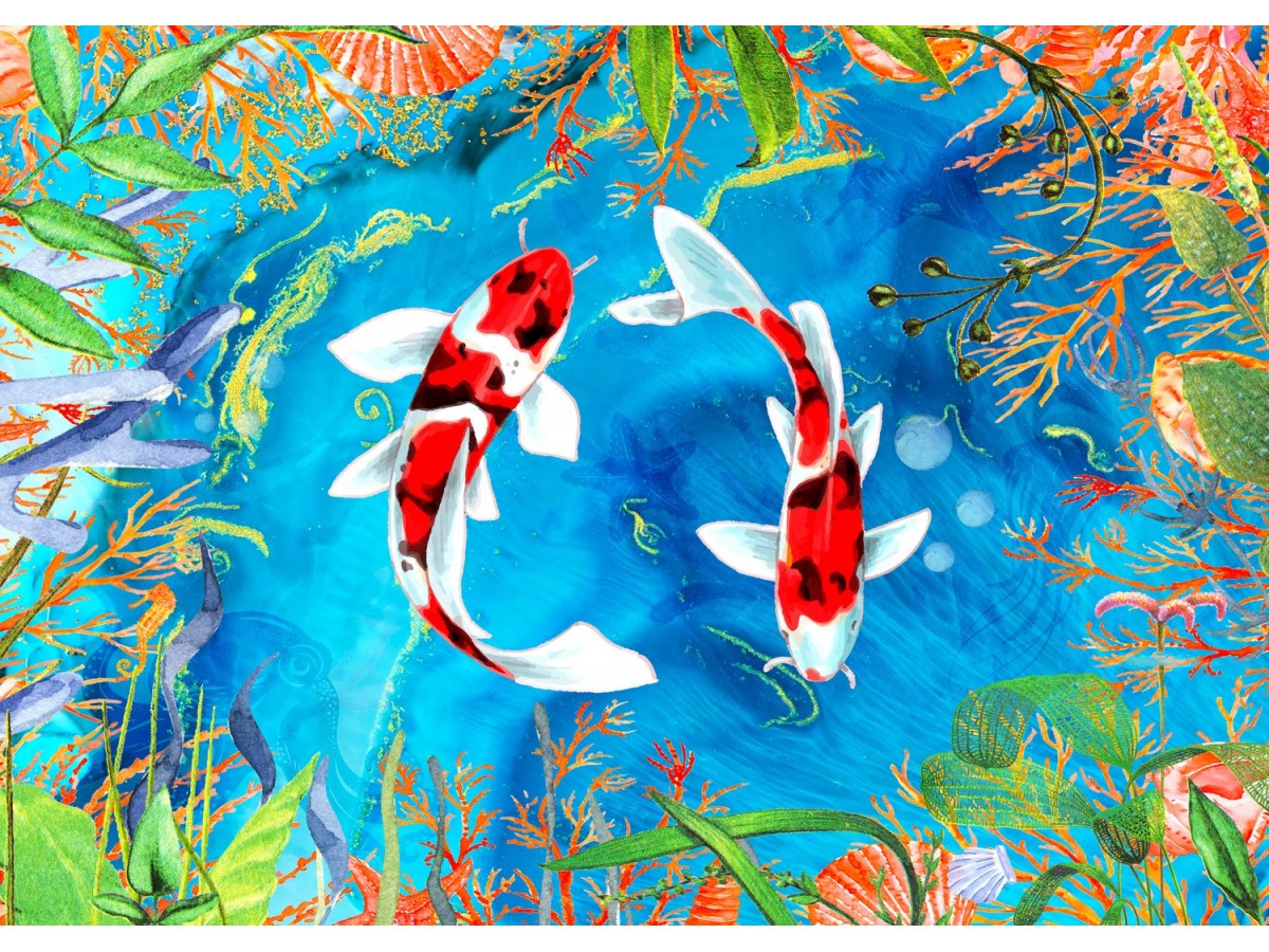 Această ilustrație colorată reprezintă doi pești koi, a căror colorație vie de roșu și alb strălucește vivid în apele albastre cristaline. Fiecare detaliu este capturat cu măiestrie, sugerind o tehnică avansată de ilustrație digitală. Peștii sunt înconjurați de vegetație acvatică luxuriantă, care include o varietate de frunze și crenguțe subacvatice, împănțite în nuanțe vii de verde, albastru și portocaliu, creând un contrast armonios cu albastrul pur al apei. Compoziția înclină să fie predominant orizontală, sugerind expansiunea calmă a unui peisaj subacvatic.