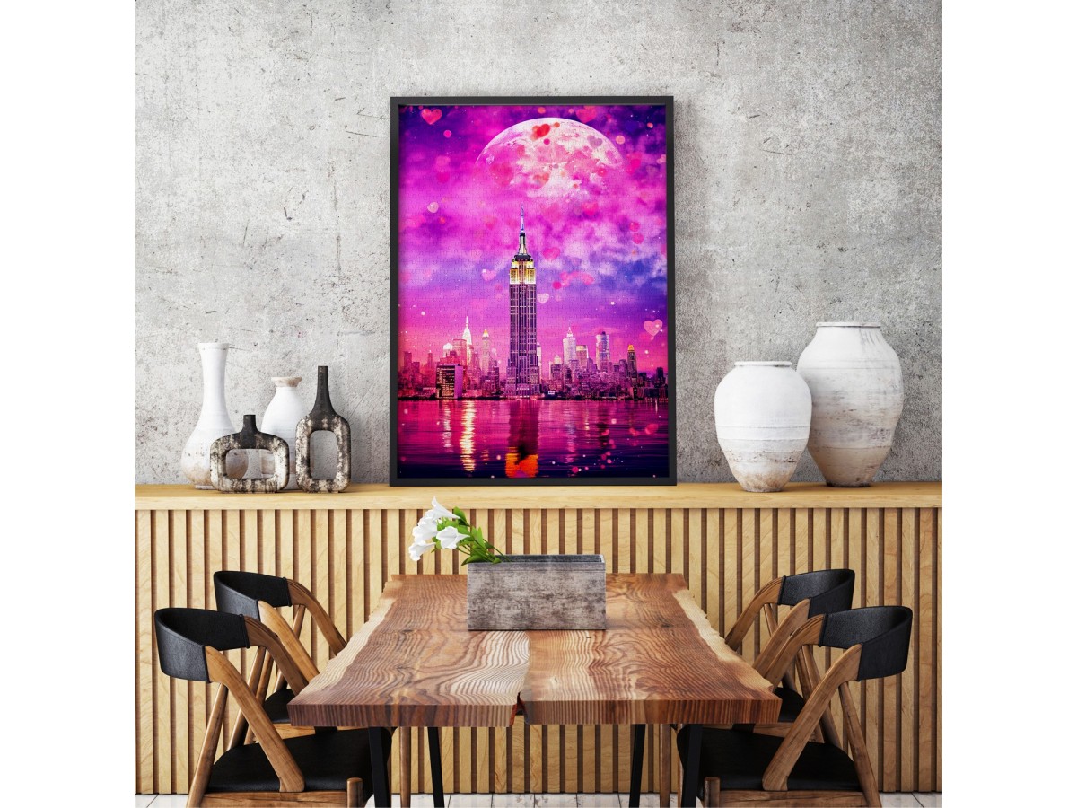 Imaginea prezintă o panoramă vibrantă a oraşului New York, cu un accent deosebit pe celebrul Empire State Building, iluminat deasupra orizontului urban. Pe fundal, un cer roz intens cu nori şi o lună uriaşă, aparent aproape de suprafaţa terestră, domină cerul, adăugând un element suprarealist scenariului. Reflecţia clădirilor şi a luminii lunii pe suprafaţa apei contribuie la o atmosferă de vis, iar elemente stilizate precum inimioare roz şi stropi de culoare intensifică aspectul fantasmagoric al compoziţiei. Este clar o ilustraţie digitală datorită utilizării culorilor saturate şi a elementelor grafice adăugate, care crează un peisaj urban idealizat şi emoţional.