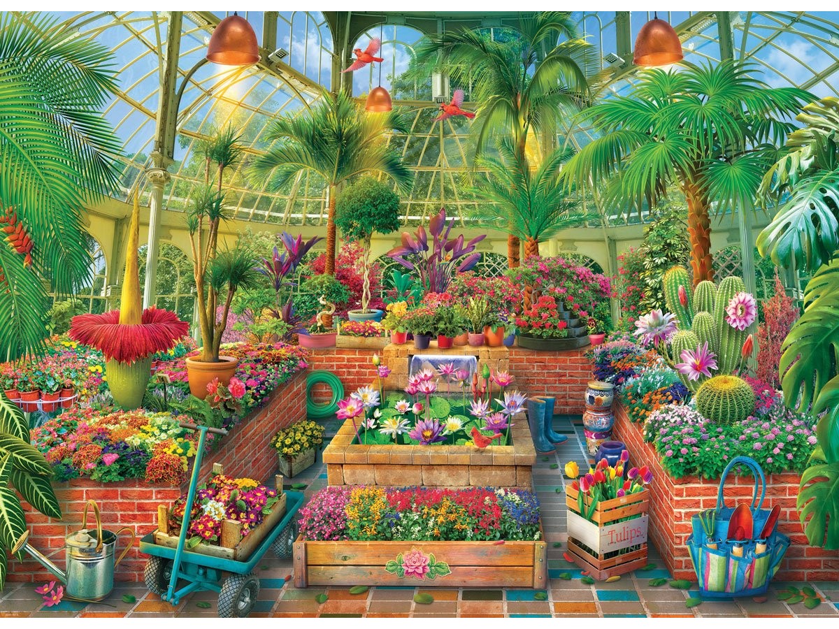 Acest puzzle Eurographics cu 1000 de piese redă o grădină de seră idilică, creată de artistul Eduard. Imaginea surprinde o varietate impresionantă de plante și flori, aranjate cu grijă într-un decor plin de culoare și lumină. De sub acoperișul transparent al serii, razele soarelui pătrund în scenă, evidențiind frumusețea detaliilor: de la verdele intens al frunzelor la nuanțele vibrante de roz, roșu și galben ale florilor. O fântână arteziană centrală adaugă o notă de liniște și eleganță vizuală, completând atmosfera relaxantă a grădinii.