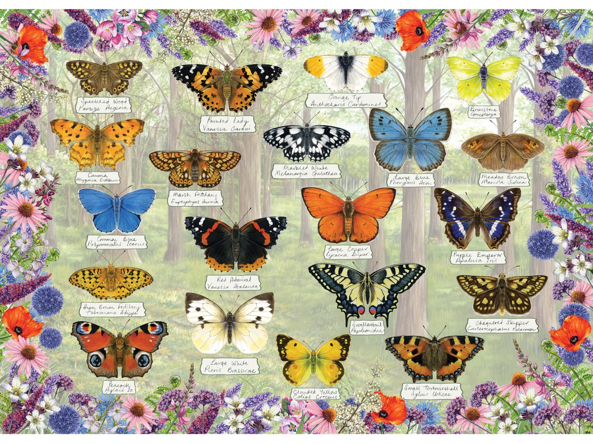 Imaginea prezentă pe puzzle-ul Gibsons 1000 piese Beautiful Butterflies te surprinde cu o colecție variată de fluturi, fiecare reprezentat într-un mod detaliat și colorat. Fiecare fluture este identificat prin numele său științific, cum ar fi 'Aglais io' sau 'Celastrina argiolus', și sunt plasați într-un fundal floral bogat în nuanțe de violet, roz și galben. Fluturii sunt aranjați pe coloane, fiecare coloană fiind structurată pe verticală, oferind o ordonare clară și estetică a speciilor. Ilustrația imită o lucrare în acuarelă prin stilul și tehnicile vizuale folosite, inclusiv umbrele și detaliile fine ale fiecărui fluture.