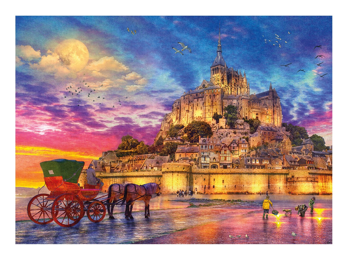 Imaginea puzzle-ului Gibsons cu 1000 de piese Mont Saint-Michel ilustrează un peisaj vibrant și dramatic al celebrului loc situat pe coasta Normandiei, Franța. Cerul roșuatic și turcoaz, presărat de nori și o lună strălucitoare, oferă un fundal spectaculos pentru abordarea apusului. Figuri umane se plimbă lin pe plaja nisipoasă, unele purtând lumini, adăugând un element pitoresc peisajului. În stânga, o căruță veche completează imaginea rustică, în timp ce abatia masivă, iluminată de ultimele raze ale soarelui, domină peisajul cu grandoare.