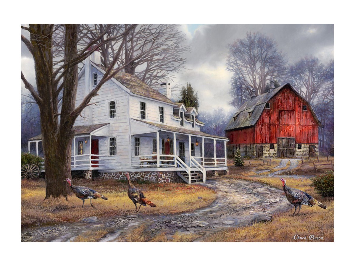 Această pictură, realizată de Chuck Pinson, intitulată 'The Way It Used To Be', ilustrează o scenă rustică, evocând amintirile unei Americi de altădată. Observăm o casă tradițională americană, cu structură din lemn, vopsită în alb, având un pridvor larg și o scară ce duce spre intrare. Lângă casă, se află un hambar mare, de culoare roșie, care adăpostește diverse unelte agricole, și un car cu roți din lemn. Peisajul este completat de prezența a trei curcani care se plimbă liber prin curte, marcând un cadru liniștit și pastoral. Fundalul este alcătuit din copaci goi, sugerând o zi de toamnă târzie sau începutul iernii.