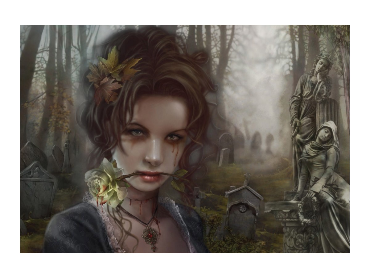 Această ilustrație digitală realizată de Cris Ortega, intitulată 'The Graveyard', surprinde o scenă sombră și mistică într-un cimitir. Personajul central este o tânără cu părul închis la culoare, îmbrăcată elegant, care ține în mână o floare galbenă, contrastând cu atmosfera întunecată a locului. În spatele ei, mormintele și statuile adaugă o notă gotică compoziției, întărite de ceața densă ce se răspândește printre copacii înalți și goi. Lumina slabă subliniază detaliile fine ale ilustrației, creând un efect vizual captivant și misterios.