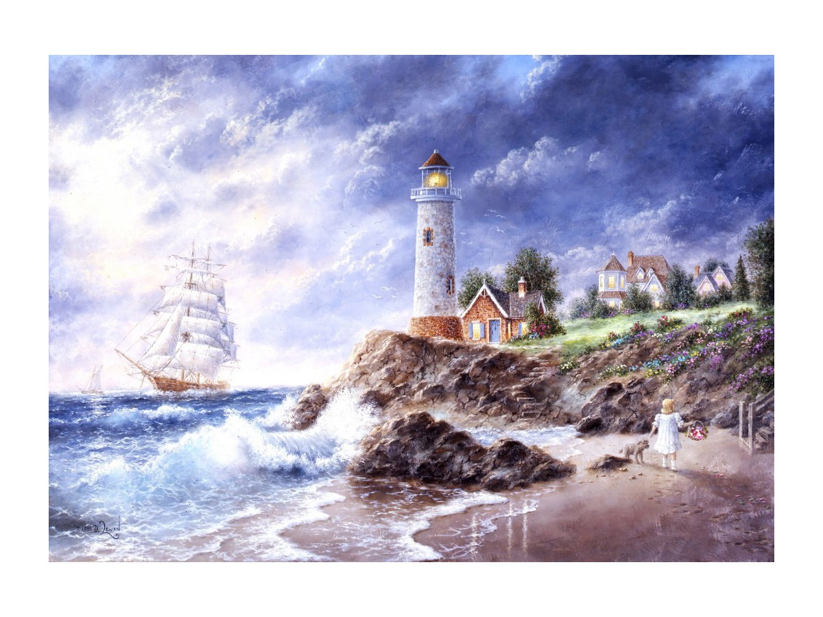 Această pictură realizată de Dennis Lewan reprezintă o scenă pitorească numită Anchor Cove. Ilustrația prezintă un far situat pe o stâncă la malul mării, pe fundalul unui cer acoperit parțial de nori amenințători. O mare agitată bate în stânci, stropind farul și întrerupând liniștea locului. Pe țărm, mai multe case mici, posibil de pescari, sunt așezate aleator între vegetația verde, iar o cărăruie duce spre far, sugerând o legătură între activitățile umane și natura înconjurătoare. De asemenea, pe mare, o corabie în stil vechi navighează, adăugând un element de nostalgie și evocând perioada marilor descoperiri geografice. O figură umană, o femeie în rochie albă, contemplă peisajul de pe plajă, adăugând o notă de contemplare și admirație pentru forța naturii.