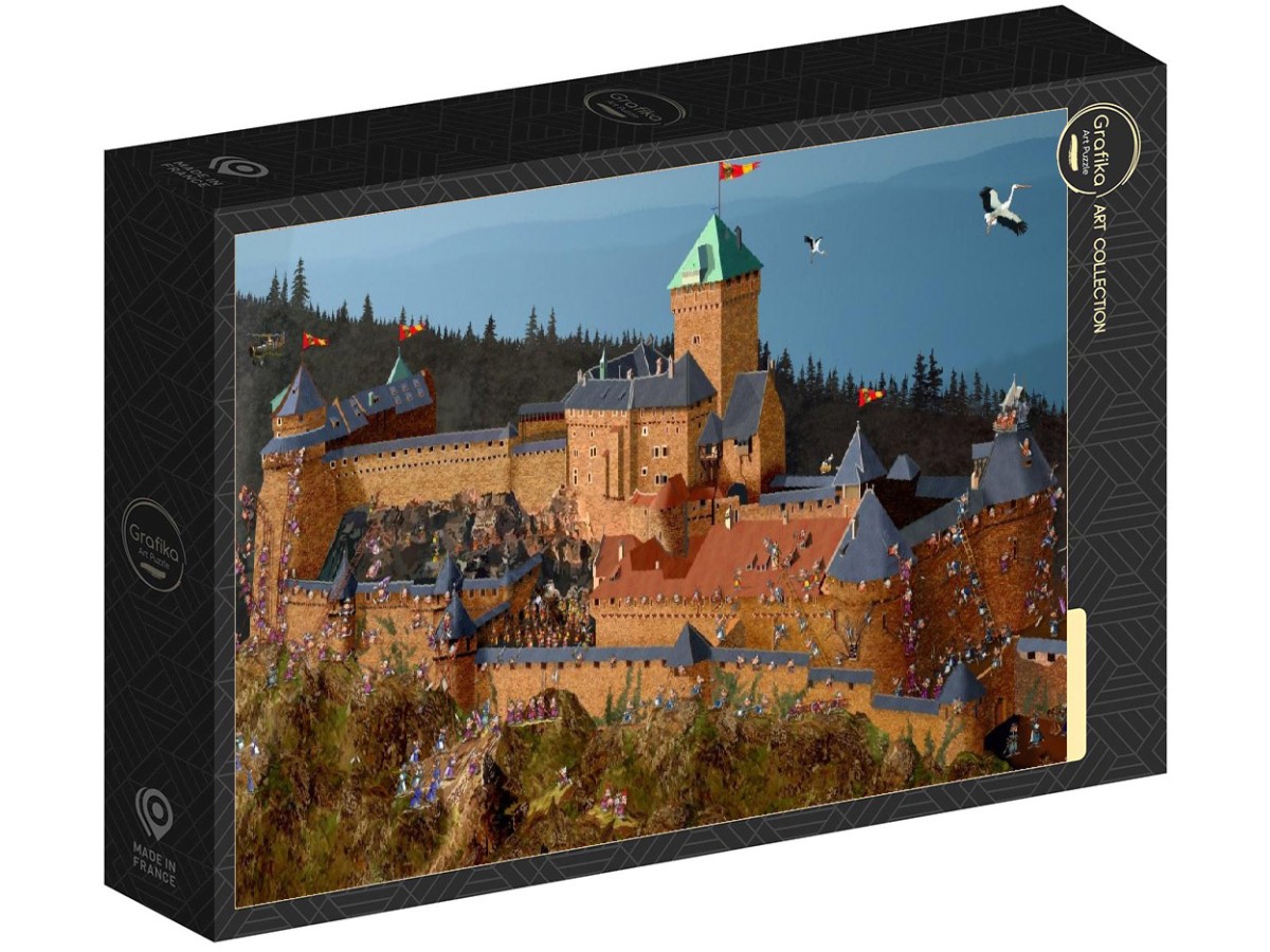 Imaginea acestui puzzle cu 1000 piese Grafika - Francois Ruyer: Haut-Koenigsbourg Castle (Grafika-F-33308) surprinde un castel medieval impunător aflat pe un deal împădurit, într-o zi senină. Castelul Haut-Koenigsbourg, așa cum este cunoscut, se remarcă prin arhitectura sa robustă, cu turnuri înalte, ziduri groase din piatră și acoperișuri roșiatice. În prim-plan, mulțimile de oameni sunt reprezentate într-un stil evocator al picturilor istorice, suggerând o scenă de festivitate sau adunare importantă. În jurul castelului, peisajul este animat de plante verzi și câțiva copaci, contrastând cu structura dominantă a fortificației. Elemente tipice unei reprezentări medievale europene, precum steaguri colorate fluturând și lumina caldă a soarelui care accentuează texturile zidurilor, completează tabloul.