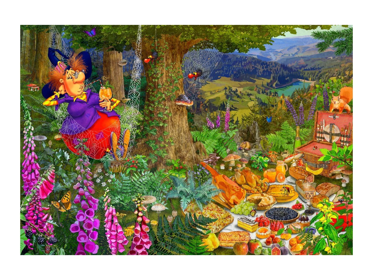 Această ilustrație, realizată de Francois Ruyer, redă un picnic vrăjitoresc în inima unei păduri dense. Domină scena centrală o vrăjitoare colorat îmbăcată în mov, cu o pălărie asortată, care se odihnește pe o mătură plină de delicatese. În spatele ei, peisajul se deschide către o vale de munte pitorească, presărată cu case rurale și lacuri strălucitoare. Este o ilustrație detaliată, plină de elemente fantastice și natură exuberantă, care captează imaginația privitorului prin combinația de fantezie și natură.