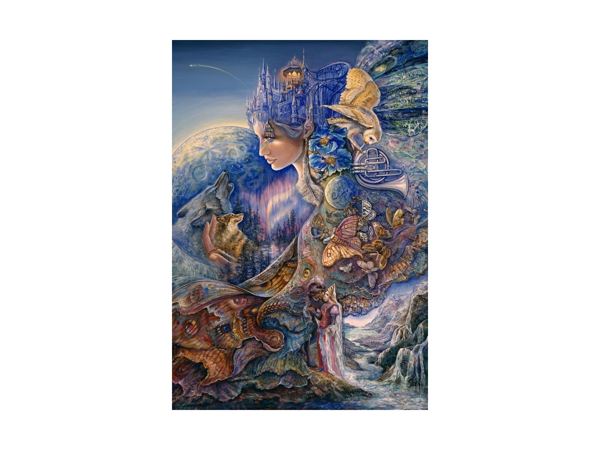 Ilustrația realizată de Josephine Wall, intitulată 'Once in a Blue Moon', dezvăluie o compoziție impresionantă și complexă, ce combină elemente fantastice și naturale într-un peisaj visător. În centrul lucrării se observă o figură feminină, încorporând în trăsăturile sale detalii arhitecturale ce amintesc de un castel medieval, sugerind o posibilă regalitate. Chipul ei este încadrat de stele și un cer nocturn, creând o atmosferă mistică. În jurul acestei figuri centrale se află diverse elemente ale faunei, cum ar fi lupi și păsări, și ale florei, reprezentate prin arbori și plante, care par să se contopească într-un fundal ce evocă magia și misterul. Această operă este un exemplu splendid de artă fantastică, ce conține Număroase detalii și culori care captează și stârnesc imaginația privitorului.